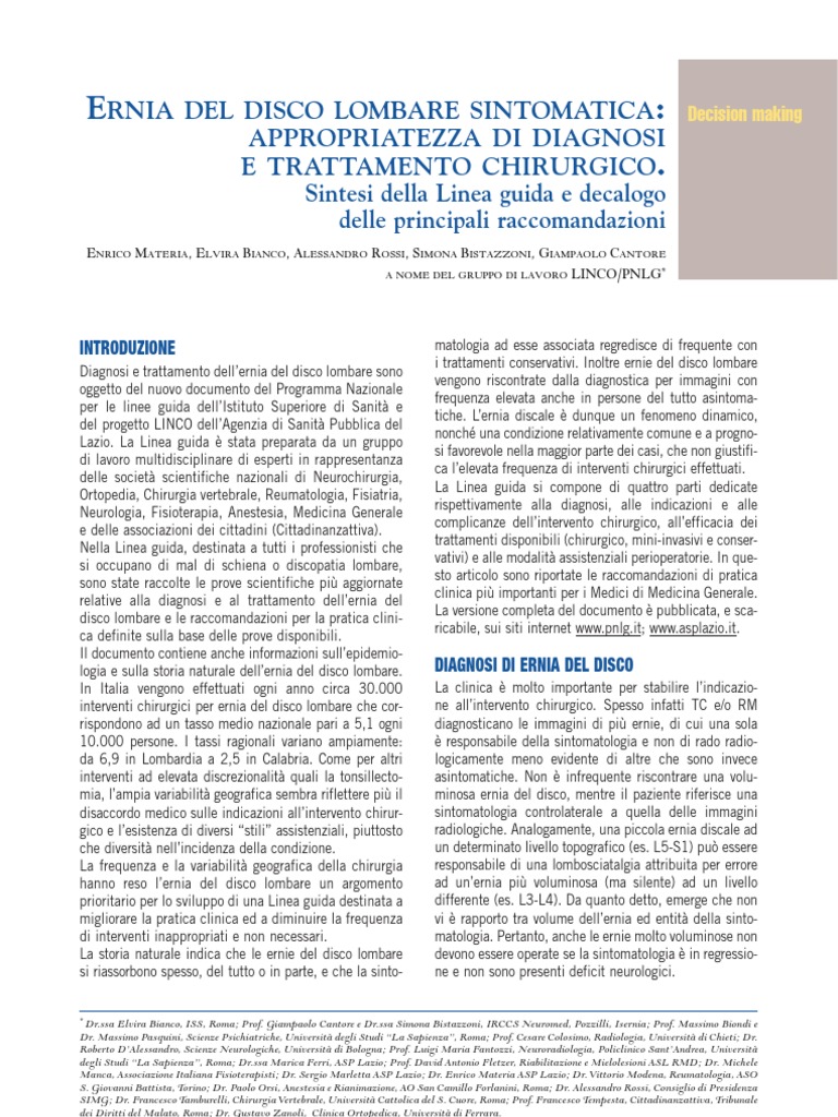 matologia ad esse associata regredisce di frequente con i trattamenti conservativi. Inoltre ernie del disco lombare vengono riscontrate dalla diagnostica per immagini con frequenza elevata anche in persone del tutto asintomatiche. Lernia discale dunque un fenomeno dinamico, nonch una condizione relativamente comune e a prognosi favorevole nella maggior parte dei casi, che non giustifica lelevata frequenza di interventi chirurgici effettuati. La Linea guida si compone di quattro parti dedicate rispettivamente alla diagnosi, alle indicazioni e alle complicanze dellintervento chirurgico, allefficacia dei trattamenti disponibili (chirurgico, mini-invasivi e conservativi) e alle modalit assistenziali perioperatorie. In questo articolo sono riportate le raccomandazioni di pratica clinica pi importanti per i Medici di Medicina Generale. La versione completa del documento pubblicata, e scaricabile, sui siti internet [Link]; [Link].