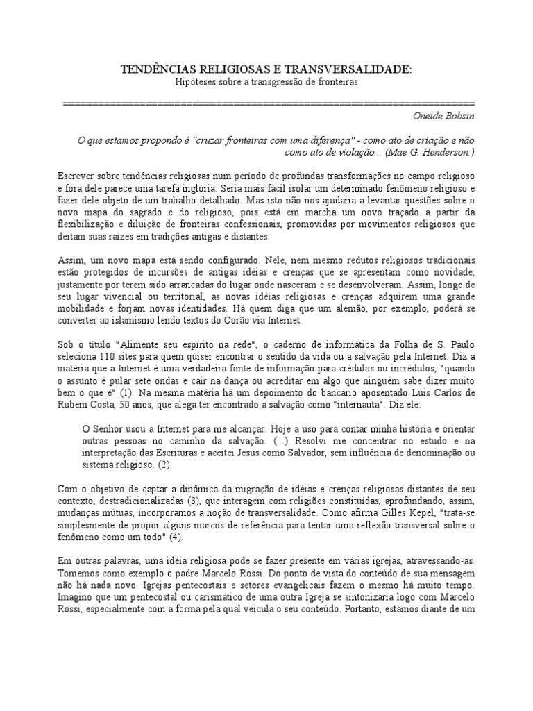 Hipteses sobre a transgresso de fronteiras ====================================================================== Oneide Bobsin O que estamos propondo "cruzar fronteiras com uma diferena" - como ato de criao e no como ato de violao... (Mae G. Henderson.) Escrever sobre tendncias religiosas num perodo de profundas transformaes no campo religioso e fora dele parece uma tarefa inglria. Seria mais fcil isolar um determinado fenmeno religioso e fazer dele objeto de um trabalho detalhado. Mas isto no nos ajudaria a levantar questes sobre o novo mapa do sagrado e do religioso, pois est em marcha um novo traado a partir da flexibilizao e diluio de fronteiras confessionais, promovidas por movimentos religiosos que deitam suas razes em tradies antigas e distantes. Assim, um novo mapa est sendo configurado. Nele, nem mesmo redutos religiosos tradicionais esto protegidos de incurses de antigas idias e crenas que se apresentam como novidade, justamente por terem sido arrancadas do lugar onde nasceram e se desenvolveram. Assim, longe de seu lugar vivencial ou territorial, as novas idias religiosas e crenas adquirem uma grande mobilidade e forjam novas identidades. H quem diga que um alemo, por exemplo, poder se converter ao islamismo lendo textos do Coro via Internet. Sob o ttulo "Alimente seu esprito na rede", o caderno de informtica da Folha de S. Paulo seleciona 110 sites para quem quiser encontrar o sentido da vida ou a salvao pela Internet. Diz a matria que a Internet uma verdadeira fonte de informao para crdulos ou incrdulos, "quando o assunto pular sete ondas e cair na dana ou acreditar em algo que ningum sabe dizer muito bem o que " (1). Na mesma matria h um depoimento do bancrio aposentado Luis Carlos de Rubem Costa, 50 anos, que alega ter encontrado a salvao como "internauta". Diz ele: O Senhor usou a Internet para me alcanar. Hoje a uso para contar minha histria e orientar outras pessoas no caminho da salvao. (...) Resolvi me concentrar no estudo e na interpretao das Escrituras e aceitei Jesus como Salvador, sem influncia de denominao ou sistema religioso. (2) Com o objetivo de captar a dinmica da migrao de idias e crenas religiosas distantes de seu contexto, destradicionalizadas (3), que interagem com religies constitudas, aprofundando, assim, mudanas mtuas, incorporamos a noo de transversalidade. Como afirma Gilles Kepel, "trata-se simplesmente de propor alguns marcos de referncia para tentar uma reflexo transversal sobre o fenmeno como um todo" (4). Em outras palavras, uma idia religiosa pode se fazer presente em vrias igrejas, atravessando-as. Tomemos como exemplo o padre Marcelo Rossi. Do ponto de vista do contedo de sua mensagem no h nada novo. Igrejas pentecostais e setores evangelicais fazem o mesmo h muito tempo. Imagino que um pentecostal ou carismtico de uma outra Igreja se sintonizaria logo com Marcelo Rossi, especialmente com a forma pela qual veicula o seu contedo. Portanto, estamos diante de um