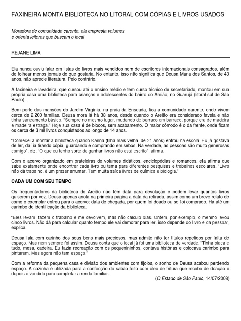 Ela nunca ouviu falar em listas de livros mais vendidos nem de escritores internacionais consagrados, alm de folhear menos jornais do que gostaria. No entanto, isso no significa que Deusa Maria dos Santos, de 43 anos, no aprecie literatura. Pelo contrrio. A faxineira e lavadeira, que cursou at o ensino mdio e tem curso tcnico de secretariado, montou em sua prpria casa uma biblioteca para crianas e adolescentes do bairro do Areio, no Guaruj (litoral sul de So Paulo). Bem perto das manses do Jardim Virgnia, na praia da Enseada, fica a comunidade carente, onde vivem cerca de 2.200 famlias. Deusa mora l h 38 anos, desde quando o Areio era considerado favela e no tinha saneamento bsico. Sempre no mesmo lugar, mudando de barraco em barraco, porque era de madeira e madeira estraga. Hoje sua casa de blocos, sem acabamento. O maior cmodo o da frente, onde ficam os cerca de 3 mil livros conquistados ao longo de 14 anos. Comecei a montar a biblioteca quando Karina (filha mais velha, de 21 anos) entrou na escola. Eu j gostava de ler, da ia tirando cpia, guardando e comprando em sebos. Na verdade, as pessoas so muito generosas comigo, diz. O que eu tenho sorte de ganhar livros no est escrito, afirma. Com o acervo organizado em prateleiras de volumes didticos, enciclopdias e romances, ela afirma que sabe exatamente onde encontrar cada livro ou tema para diferentes pesquisas e trabalhos escolares. Livro no d trabalho, um prazer arrumar. Tem muita sada livros de qumica e biologia. CADA UM COM SEU TEMPO Os frequentadores da biblioteca do Areio no tm data para devoluo e podem levar quantos livros quiserem por vez. Deusa apenas anota na primeira pgina a data da retirada, assim como um breve relato de como o exemplar entrou para o acervo: data de chegada, por quem foi doado ou se f oi comprado. H at um carimbo de identificao da biblioteca. Eles levam, fazem o trabalho e me devolvem, mas no calculo dias. Ontem, por exemplo, o menino levou cinco livros. No d para calcular quanto tempo ele vai demorar para ler, isso depende do l ivro e da pessoa, explica. Deusa fala com carinho dos seus bens mais preciosos, mas admite no ter ttulos repetidos por falta de espao. Mas nem sempre foi assim. Deusa conta que o local j foi uma biblioteca de verdade. Tinha placa e tudo, mesa, cadeira. Eu fazia recreao com os pequenininhos, contava histrias e colocava carimbo para pintarem. Mas agora no tem espao. Com a reforma da pequena casa e diviso dos ambientes com tijolos, o sonho de Deusa acabou perdendo espao. A cozinha utilizada para a confeco de sabo feito com leo de fritura que recebe de doao e depois vendido para completar a renda familiar. (O Estado de So Paulo, 14/07/2008)