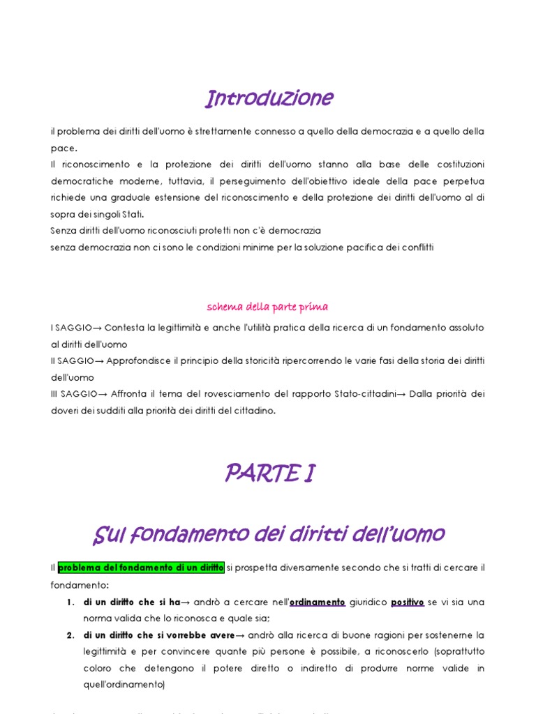 Oltre che mal definibile e variabile, la classe dei diritti dell'uomo anche eterogenea Nelle diverse dichiarazioni vi sono pretese non solo molto diverse tra loro ma anche spesso incompatibili le ragioni che valgono per sostenere le une non valgono per sostenere le altre NON SI POTR QUINDI PARLARE DI FONDAMENTO DEI DIRITTI DELL'UOMO, MA AL PI DI DIVERSI FONDAMENTI. Tra i diritti umani ve ne sono alcuni che valgono in ogni situazione e per tutti gli Nemmeno al nemmeno per uomini indistintamente: sono quelli che si chiede non vengano limitati verificarsi di casi eccezionali categorie ristrettissime di persone Es. il diritto a non essere torturati sono diritti privilegiati, poich non vengono posti in concorrenza con altri diritti anche essi fondamentali Sono ben pochi nella maggior parte dei casi sia il diritto che si afferma sia quello che si nega hanno le loro buone ragioni in questo caso la scelta dubbia e richiede di essere motivata La soluzione sta nel introdurre dei limiti all'estensione di uno dei due diritti e, in modo che sia in parte salvaguardato anche l'altro. Appare ovvio che diritti che sono s fondamentali, ma anche sottoponibili a restrizioni, non possono avere fondamento assoluto non permetterebbe di dare una valida giustificazione alla restrizione.