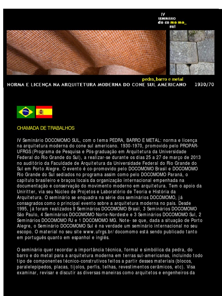 sul americano. 1930-1970, promovido pelo PROPARUFRGS (Programa de Pesquisa e Ps-graduao em Arquitetura da Universidade Federal do Rio Grande do Sul), a realizar-se durante os dias 25 a 27 de maro de 2013 no auditrio da Faculdade de Arquitetura da Universidade Federal do Rio Grande do Sul em Porto Alegre. O evento co-promovido pelo DOCOMOMO Brasil e DOCOMOMO Rio Grande do Sul sediados no programa assim como pelo DOCOMOMO Paran, o captulo brasileiro e braos locais da organizao internacional empenhada na documentao e conservao do movimento moderno em arquitetura. Tem o apoio da Uniritter, via seu Ncleo de Projetos e Laboratrio de Teoria e Histria da Arquitetura. O seminrio se enquadra na srie dos seminrios DOCOMOMO, j consagrados como o principal evento sobre a arquitetura moderna no pas. Desde 1995, j foram realizados 9 Seminrios DOCOMOMO Brasil, 3 Seminrios DOCOMOMO So Paulo, 4 Seminrios DOCOMOMO Norte-Nordeste e 3 Seminrios DOCOMOMO Sul, 2 Seminrios DOCOMOMO RJ e 1 DOCOMOMO MG. Note- se que, dada a situao de Porto Alegre, o Seminrio DOCOMOMO Sul na verdade um seminrio internacional no seu escopo. O material no seu site www.ufrgs.br/docomomo est sendo publicado tanto em portugus quanto em espanhol e ingls. O seminrio quer recordar a importncia tcnica, formal e simblica da pedra, do barro e do metal para a arquitetura moderna em terras sul-americanas, incluindo todo tipo de componentes tcnico-construtivos feitos a partir desses materiais (blocos, paraleleppedos, placas, tijolos, perfis, telhas, revestimentos cermicos, etc). Visa examinar, revisar e discutir as diversas maneiras como arquitetos e engenheiros da