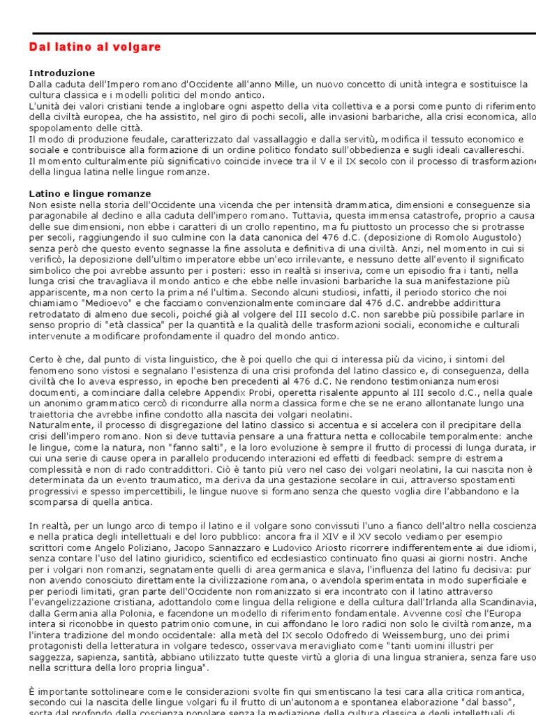 professione: insomma, una specie di slancio vitale che spazz via una tradizione ormai fiacca e isterilita, sostituendola con forme pi libere e pronte ad accogliere la sensibilit di un mondo nuovo. Al contrario, la mediazione e il filtraggio ci furono, fino a produrre, soprattutto nell'area romanza, un bilinguismo in cui latino e volgare non si configuravano come opzioni alternative, ma come soluzioni complementari e integrate da utilizzare di volta in volta a seconda dei contesti, dei generi e dei destinatari. evidente come un approccio di questo genere al problema delle origini renda estremamente difficile, e anzi, a rigore impossibile, stendere il certificato di nascita delle lingue neo- e postlatine, indicando con precisione "quando" e "dove" si verificata la frattura tra latino e volgare: perch, semplicemente, questa frattura non c'. Tuttavia, se assurdo mettersi alla ricerca di qualcosa che non esiste, resta comunque importante individuare e studiare le prime testimonianze che documentano l'affermazione del volgare: avremo cos la possibilit di fissare alcuni concreti riferimenti cronologici, geografici e linguistici che ci permetteranno di comprendere meglio il percorso compiuto da queste nuove esperienze della comunicazione e le tappe della loro successiva evoluzione.