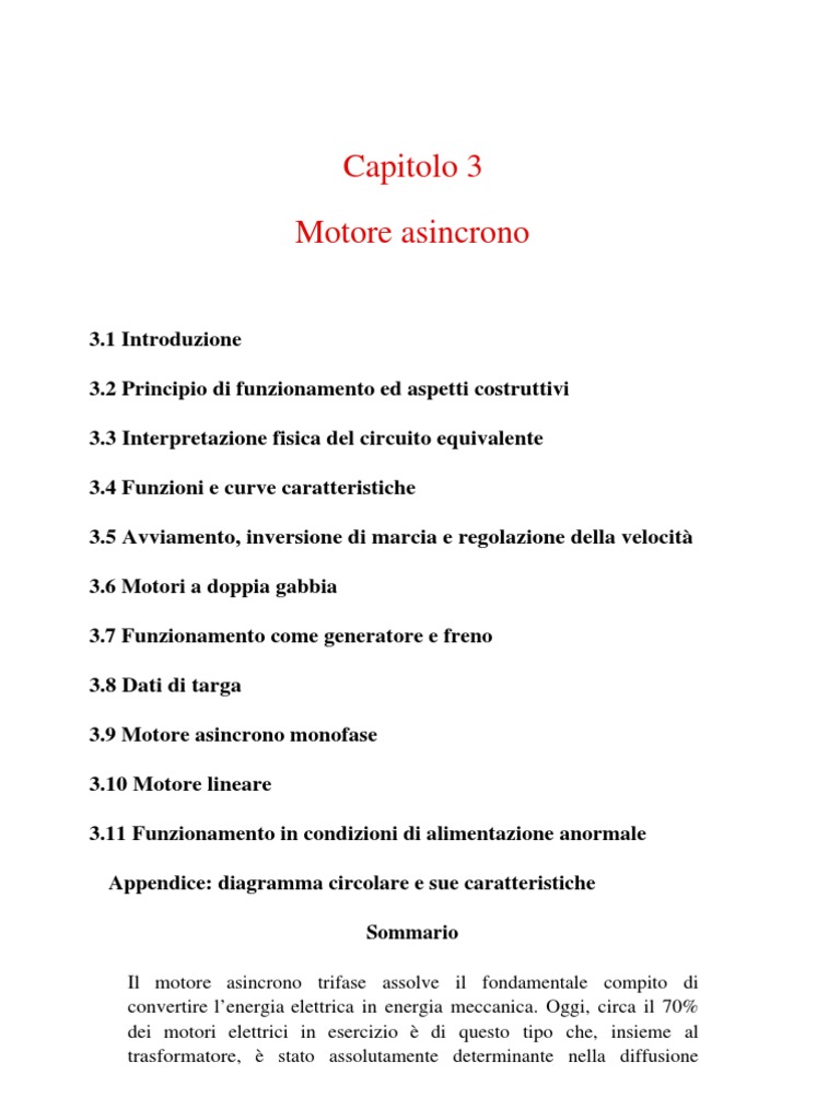 3.1 Introduzione 3.2 Principio di funzionamento ed aspetti costruttivi 3.3 Interpretazione fisica del circuito equivalente 3.4 Funzioni e curve caratteristiche 3.5 Avviamento, inversione di marcia e regolazione della velocit 3.6 Motori a doppia gabbia 3.7 Funzionamento come generatore e freno 3.8 Dati di targa 3.9 Motore asincrono monofase 3.10 Motore lineare 3.11 Funzionamento in condizioni di alimentazione anormale Appendice: diagramma circolare e sue caratteristiche Sommario Il motore asincrono trifase assolve il fondamentale compito di convertire lenergia elettrica in energia meccanica. Oggi, circa il 70% dei motori elettrici in esercizio di questo tipo che, insieme al trasformatore, stato assolutamente determinante nella diffusione