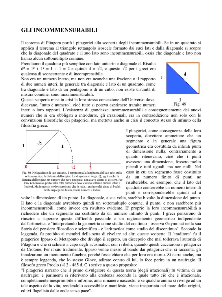 Il teorema di Pitagora port i pitagorici alla scoperta degli incommensurabili. Se in un quadrato si applica il teorema al triangolo rettangolo isoscele formato dai suoi lati e dalla diagonale si scopre che la diagonale del quadrato e il suo lato sono incommensurabili, ossia che diagonale e lato non hanno alcun sottomultiplo comune. Prendiamo il quadrato pi semplice con lato unitario e diagonale d. Risulta d = 1 + 1 = 1 + 1 = 2 e quindi d = H TXHVWR SHU L JUHFL HUD qualcosa di sconcertante e di incomprensibile. Non era un numero intero, ma non era neanche una frazione o il rapporto di due numeri interi. In generale tra diagonale e lato di un quadrato, come tra diagonale e lato di un pentagono o di un cubo, non esiste un'unit di misura comune: sono incommensurabili. Questa scoperta mise in crisi la loro stessa concezione dell'Universo dove, Fig. 49 dicevano, "tutto numero", cio tutto si poteva esprimere tramite numeri interi o loro rapporti. Lesistenza di grandezze incommensurabili e conseguentemente dei nuovi numeri che si era obbligati a introdurre, gli irrazionali, era in contraddizione non solo con le convinzioni filosofiche dei pitagorici, ma metteva anche in crisi il concetto stesso di infinito della filosofia greca. I pitagorici, come conseguenza della loro scoperta, dovettero ammettere che un segmento e in generale una figura geometrica era costituita da infiniti punti di dimensione nulla, contrariamente a quanto ritenevano, cio che i punti avessero una dimensione, fossero molto piccoli e tutti uguali, ma non nulli. Nel Fig. 50 Nel quadrato di lato unitario, 1 rappresenta la lunghezza del lato ed , sulla caso in cui un segmento fosse costituito retta numerica, la distanza dall'origine. La diagonale lunga anche la da un numero finito di punti ne distanza dall'origine, un numero che per i pitagorici non aveva diritto di esistere. Per risulterebbe, ad esempio, che il lato del loro, non trovava posto sulla retta numerica dove c'erano soltanto numeri interi e frazioni. Ma in questo modo scoprirono che la retta... era in realt piena di buchi, quadrato conterrebbe un numero intero di molti inspiegabili buchi, fra un numero e l'altro. punti e corrisponderebbe quindi ad a volte la dimensione di un punto. La diagonale, a sua volta, sarebbe b volte la dimensione del punto. Il lato e la diagonale avrebbero quindi un sottomultiplo comune, il punto, e non sarebbero pi incommensurabili, come invece era risultato evidente. E' proprio la loro incommensurabilit a richiedere che un segmento sia costituito da un numero infinito di punti. I greci pensarono di riuscire a superare queste difficolt passando a un ragionamento geometrico indipendente dall'aritmetica e "interpretando la geometria come studio del continuo - osserva Geymonat nella sua Storia del pensiero filosofico e scientifico - e l'aritmetica come studio del discontinuo". Secondo la leggenda, fu proibito ai membri della setta di rivelare ad altri queste scoperte. Il "traditore" fu il pitagorico Ippaso di Metaponto che divulg il segreto, un discepolo che mal tollerava l'autorit di Pitagora e che si schier a capo degli acusmatici, con i ribelli, quando questi cacciarono i pitagorici da Crotone. Per il suo tradimento, Ippaso venne messo al bando dai pitagorici che, si racconta, gli innalzarono un monumento funebre, perch fosse chiaro che per loro era morto. Si narra anche, ma sempre leggenda, che lo stesso Giove, adirato contro di lui, lo fece perire in un naufragio. Il filosofo greco Proclo (412 - 485 d. C.) scrive a questo proposito: "I pitagorici narrano che il primo divulgatore di questa teoria [degli irrazionali] fu vittima di un naufragio; e parimenti si riferivano alla credenza secondo la quale tutto ci che irrazionale, completamente inesprimibile e informe, ama rimanere nascosto; e se qualche anima si rivolge ad un tale aspetto della vita, rendendolo accessibile e manifesto, viene trasportata nel mare delle origini, ed ivi flagellata dalle onde senza pace".