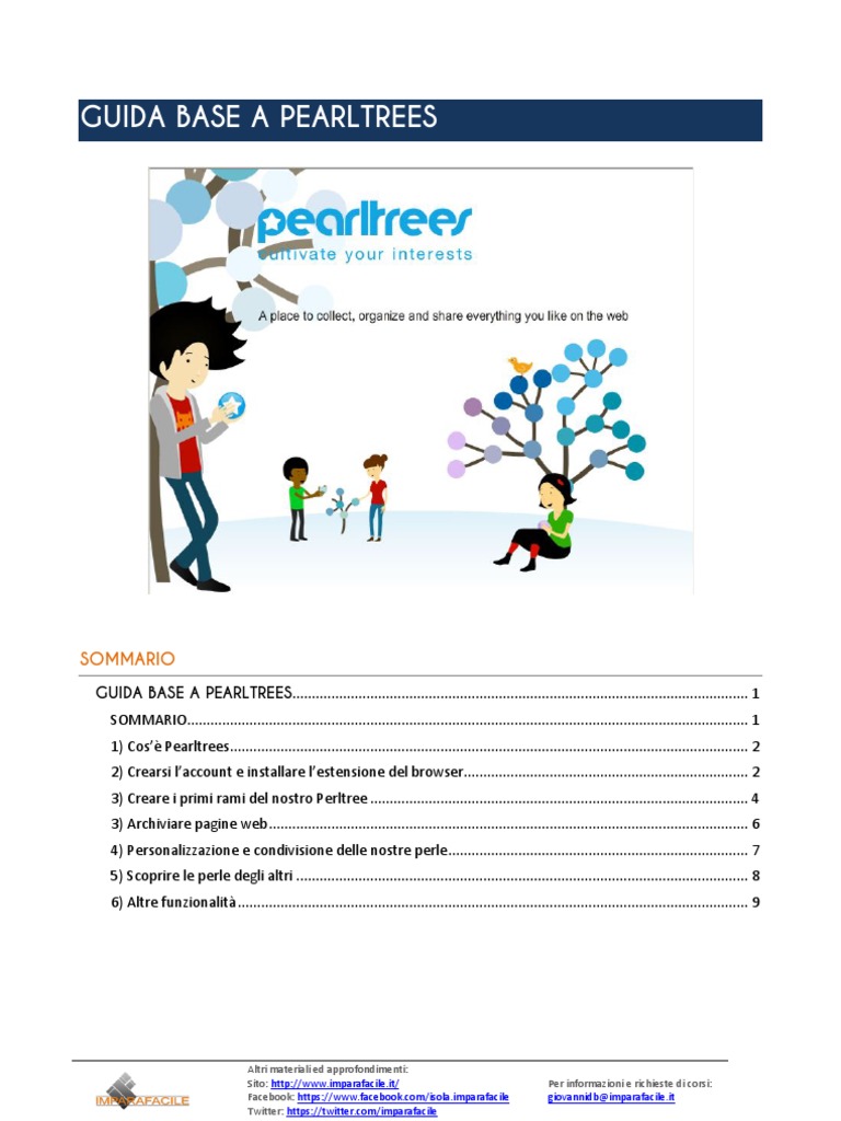 GUIDA BASE A PEARLTREES..................................................................................................................... 1 SOMMARIO................................................................................................................................................ 1 1) Cos Pearltrees ..................................................................................................................................... 2 2) Crearsi laccount e installare lestensione del browser ......................................................................... 2 3) Creare i primi rami del nostro Perltree ................................................................................................. 4 3) Archiviare pagine web ........................................................................................................................... 6 4) Personalizzazione e condivisione delle nostre perle ............................................................................. 7 5) Scoprire le perle degli altri .................................................................................................................... 8 6) Altre funzionalit ................................................................................................................................... 9