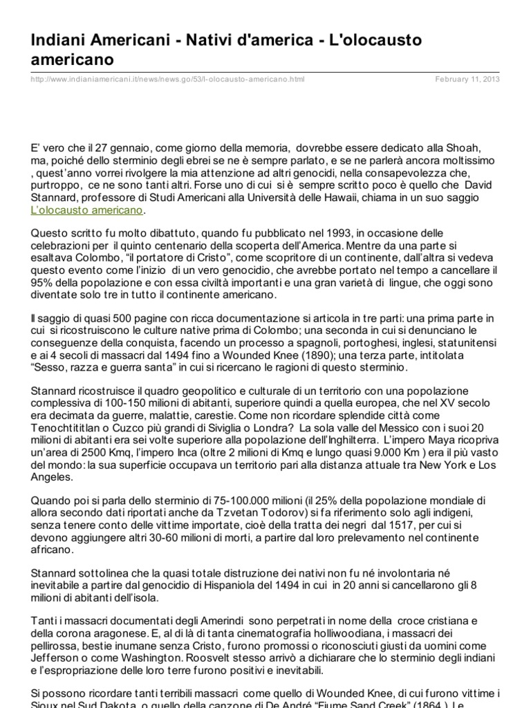 E vero che il 27 gennaio, come giorno della memoria, dovrebbe essere dedicato alla Shoah, ma, poich dello sterminio degli ebrei se ne sempre parlato, e se ne parler ancora moltissimo , questanno vorrei rivolgere la mia attenzione ad alt ri genocidi, nella consapevolezza che, purtroppo, ce ne sono tanti altri. Forse uno di cui si sempre scritto poco quello che David Stannard, professore di Studi Americani alla Universit delle Hawaii, chiama in un suo saggio Lolocausto americano. Questo scritto fu molto dibattuto, quando fu pubblicato nel 1993, in occasione delle celebrazioni per il quinto centenario della scoperta dellAmerica. Mentre da una parte si esaltava Colombo, il portatore di Cristo, come scoprit ore di un continente, dallaltra si vedeva questo evento come linizio di un vero genocidio, che avrebbe portato nel tempo a cancellare il 95% della popolazione e con essa civilt importanti e una gran variet di lingue, che oggi sono diventate solo tre in tutto il continente americano. Il saggio di quasi 500 pagine con ricca documentazione si articola in tre parti: una prima parte in cui si ricostruiscono le culture native prima di Colombo; una seconda in cui si denunciano le conseguenze della conquista, facendo un processo a spagnoli, portoghesi, inglesi, statunitensi e ai 4 secoli di massacri dal 1494 fino a Wounded Knee (1890); una terza parte, intitolata Sesso, razza e guerra santa in cui si ricercano le ragioni di questo sterminio. Stannard ricostruisce il quadro geopolitico e culturale di un territorio con una popolazione complessiva di 100-150 milioni di abitanti, superiore quindi a quella europea, che nel XV secolo era decimata da guerre, malattie, carestie. Come non ricordare splendide citt come Tenochtititlan o Cuzco pi grandi di Siviglia o Londra? La sola valle del Messico con i suoi 20 milioni di abitanti era sei volte superiore alla popolazione dellInghilterra. Limpero Maya ricopriva unarea di 2500 Kmq, limpero Inca (oltre 2 milioni di Kmq e lungo quasi 9.000 Km ) era il pi vasto del mondo: la sua superficie occupava un territorio pari alla distanza attuale tra New York e Los Angeles. Quando poi si parla dello sterminio di 75-100.000 milioni (il 25% della popolazione mondiale di allora secondo dati riportati anche da Tzvetan Todorov) si fa riferimento solo agli indigeni, senza tenere conto delle vittime importate, cio della tratta dei negri dal 1517, per cui si devono aggiungere altri 30-60 milioni di morti, a partire dal loro prelevamento nel continente africano. Stannard sottolinea che la quasi totale distruzione dei nativi non fu n involontaria n inevitabile a partire dal genocidio di Hispaniola del 1494 in cui in 20 anni si cancellarono gli 8 milioni di abitanti dellisola. Tanti i massacri documentati degli Amerindi sono perpet rati in nome della croce cristiana e della corona aragonese. E, al di l di tanta cinematografia holliwoodiana, i massacri dei pellirossa, bestie inumane senza Cristo, furono promossi o riconosciuti giusti da uomini come Jefferson o come Washington. Roosvelt stesso arriv a dichiarare che lo sterminio degli indiani e lespropriazione delle loro terre furono positivi e inevitabili. Si possono ricordare tanti terribili massacri come quello di Wounded Knee, di cui furono vittime i Sioux nel Sud Dakota, o quello della canzone di De Andr Fiume Sand Creek (1864 ). Le truppe sotto bandiere di pace trucidarono vecchi, donne, bambini, neonati. Strapparono