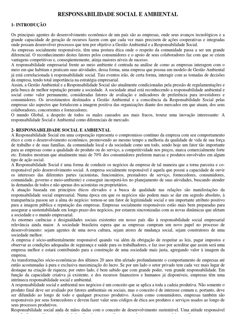 1- INTRODUO Os principais agentes do desenvolvimento econmico de um pas so as empresas, onde seus avanos tecnolgicos e a grande capacidade de gerao de recursos fazem com que cada vez mais precisem de aes cooperativas e integradas onde possam desenvolver processos que tem por objetivo a Gesto Ambiental e a Responsabilidade Social. As empresas socialmente responsveis, tm uma postura tica onde o respeito da comunidade passa a ser um grande diferencial. O reconhecimento destes fatores pelos consumidores e o apoio de seus colaboradores faz com que se criem vantagens competitivas e, conseqentemente, atinja maiores nveis de sucesso. A responsabilidade empresarial frente ao meio ambiente centrada na anlise de como as empresas interagem com o meio em que habitam e praticam suas atividades, dessa forma, uma empresa que possua um modelo de Gesto Ambiental j est correlacionada responsabilidade social. Tais eventos iro, de certa forma, interagir com as tomadas de decises da empresa, tendo total importncia na estratgia empresarial. Assim, a Gesto Ambiental e a Responsabilidade Social so atualmente condicionadas pela presso de regulamentaes e pela busca de melhor reputao perante a sociedade. A sociedade atual est reconhecendo a responsabilidade ambiental e social como valor permanente, consideradas fatores de avaliao e indicadores de preferncia para investidores e consumidores. Os investimentos destinados a Gesto Ambiental e a conscincia da Responsabilidade Social pelas empresas so aspectos que fortalecem a imagem positiva das organizaes diante dos mercados em que atuam, dos seus colaboradores, concorrentes e fornecedores. O mundo Global, a despeito de todos os males causados aos mais fracos, trouxe uma inovao interessante: A responsabilidade Social e Ambiental como diferenciais de mercado. 2- RESPONSABILIDADE SOCIAL E AMBIENTAL A Responsabilidade Social em uma corporao representa o compromisso contnuo da empresa com seu comportamento tico e com o desenvolvimento econmico, promovendo ao mesmo tempo a melhoria da qualidade de vida de sua fora de trabalho e de suas famlias, da comunidade local e da sociedade como um todo, sendo hoje um fator to importante para as empresas como a qualidade do produto ou do servio, a competitividade nos preos, marca comercialmente forte etc. Estudos mostram que atualmente mais de 70% dos consumidores preferem marcas e produtos envolvidos em algum tipo de ao social. A Responsabilidade Social uma forma de conduzir os negcios da empresa de tal maneira que a torna parceira e coresponsvel pelo desenvolvimento social. A empresa socialmente responsvel aquela que possui a capacidade de ouvir os interesses das diferentes partes (acionistas, funcionrios, prestadores de servio, fornecedores, consumidores, comunidade, governo e meio-ambiente) e conseguir incorpor-los no planejamento de suas atividades, buscando atender s demandas de todos e no apenas dos acionistas ou proprietrios. A atuao baseada em princpios ticos elevados e a busca de qualidade nas relaes so manifestaes da responsabilidade social empresarial. Numa poca em que os negcios no podem mais se dar em segredo absoluto, transparncia passou ser a alma do negcio: tornou-se um fator de legitimidade social e um importante atributo positivo para a imagem pblica e reputao das empresas. Empresas socialmente responsveis esto mais bem preparadas para assegurar a sustentabilidade em longo prazo dos negcios, por estarem sincronizadas com as novas dinmicas que afetam a sociedade e o mundo empresarial. As enormes carncias e desigualdades sociais existentes em nosso pas do responsabilidade social empresarial relevncia ainda maior. A sociedade brasileira espera que as empresas cumpram um novo papel no processo de desenvolvimento: sejam agentes de uma nova cultura, sejam atores de mudana social, sejam construtores de uma sociedade melhor. A empresa scio-ambientalmente responsvel quando vai alm da obrigao de respeitar as leis, pagar impostos e observar as condies adequadas de segurana e sade para os trabalhadores, e faz isso por acreditar que assim ser uma empresa melhor e estar contribuindo para a construo de uma sociedade mais justa, agregando valor imagem da empresa. As transformaes scio-econmicas dos ltimos 20 anos tm afetado profundamente o comportamento de empresas at ento acostumadas pura e exclusiva maximizao do lucro. Se por um lado o setor privado tem cada vez mais lugar de destaque na criao de riqueza; por outro lado, bem sabido que com grande poder, vem grande responsabilidade. Em funo da capacidade criativa j existente, e dos recursos financeiros e humanos j disponveis, empresas tm uma intrnseca responsabilidade social e ambiental. A responsabilidade social e ambiental nos negcios um conceito que se aplica a toda a cadeia produtiva. No somente o produto final deve ser avaliado por fatores ambientais ou sociais, mas o conceito de interesse comum e, portanto, deve ser difundido ao longo de todo e qualquer processo produtivo. Assim como consumidores, empresas tambm so responsveis por seus fornecedores e devem fazer valer seus cdigos de tica aos produtos e servios usados ao longo de seus processos produtivos. Responsabilidade social anda de mos dadas com o conceito de desenvolvimento sustentvel. Uma atitude responsvel em relao ao ambiente e sociedade, no s garante a no escassez de recursos, mas tambm amplia o conceito a uma