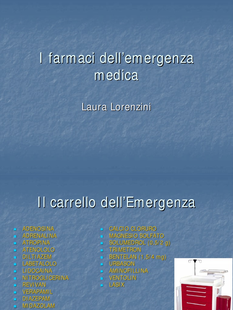 ADENOSINA ADRENALINA ATROPINA ATENOLOLO DILTIAZEM LABETALOLO LIDOCAINA NITROGLICERINA REVIVAN VERAPAMIL DIAZEPAM MIDAZOLAM FLUMAZENIL (0,5/1 mg) NALOXONE