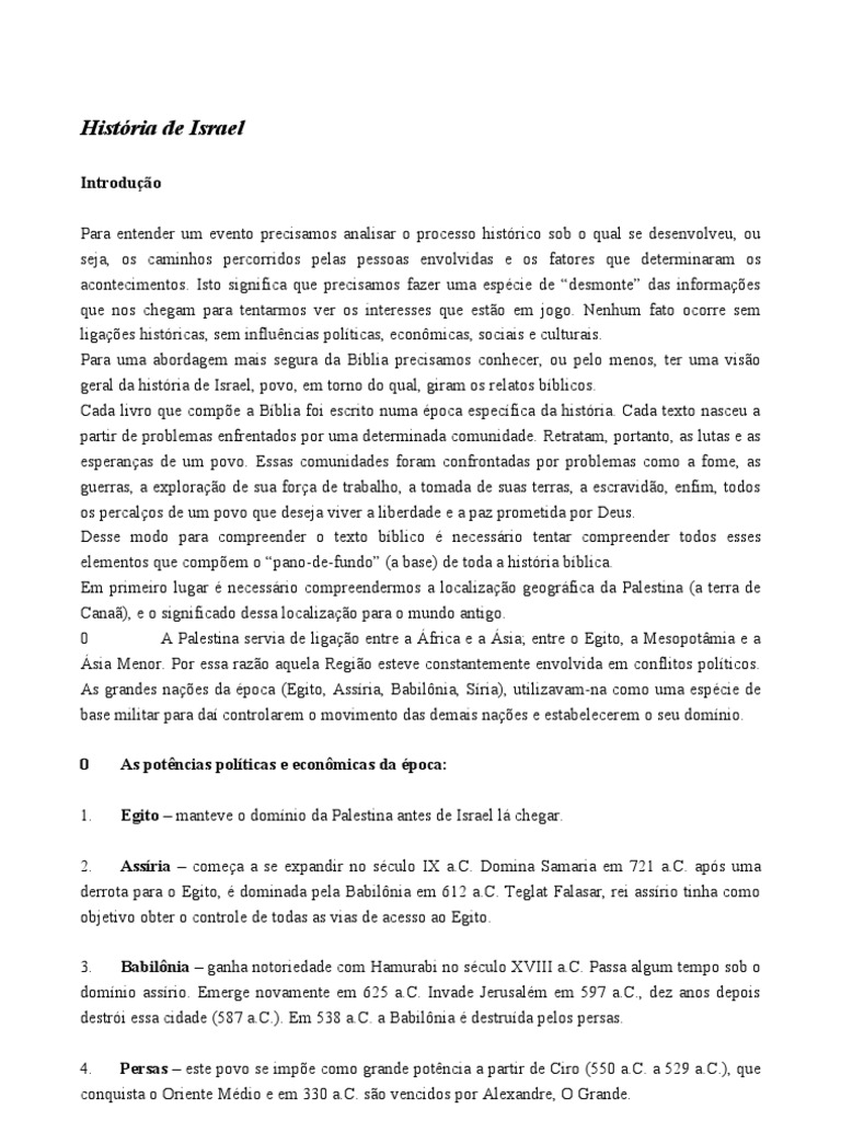 Introduo Para entender um evento precisamos analisar o processo histrico sob o qual se desenvolveu, ou seja, os caminhos percorridos pelas pessoas envolvidas e os fatores que determinaram os acontecimentos. Isto significa que precisamos fazer uma espcie de desmonte das informaes que nos chegam para tentarmos ver os interesses que esto em jogo. Nenhum fato ocorre sem ligaes histricas, sem influncias polticas, econmicas, sociais e culturais. Para uma abordagem mais segura da Bblia precisamos conhecer, ou pelo menos, ter uma viso geral da histria de Israel, povo, em torno do qual, giram os relatos bblicos. Cada livro que compe a Bblia foi escrito numa poca especfica da histria. Cada texto nasceu a partir de problemas enfrentados por uma determinada comunidade. Retratam, portanto, as lutas e as esperanas de um povo. Essas comunidades foram confrontadas por problemas como a fome, as guerras, a explorao de sua fora de trabalho, a tomada de suas terras, a escravido, enfim, todos os percalos de um povo que deseja viver a liberdade e a paz prometida por Deus. Desse modo para compreender o texto bblico necessrio tentar compreender todos esses elementos que compem o pano-de-fundo (a base) de toda a histria bblica. Em primeiro lugar necessrio compreendermos a localizao geogrfica da Palestina (a terra de Cana), e o significado dessa localizao para o mundo antigo. 0 A Palestina servia de ligao entre a frica e a sia; entre o Egito, a Mesopotmia e a sia Menor. Por essa razo aquela Regio esteve constantemente envolvida em conflitos polticos. As grandes naes da poca (Egito, Assria, Babilnia, Sria), utilizavam-na como uma espcie de base militar para da controlarem o movimento das demais naes e estabelecerem o seu domnio. 0 1. As potncias polticas e econmicas da poca: Egito manteve o domnio da Palestina antes de Israel l chegar.