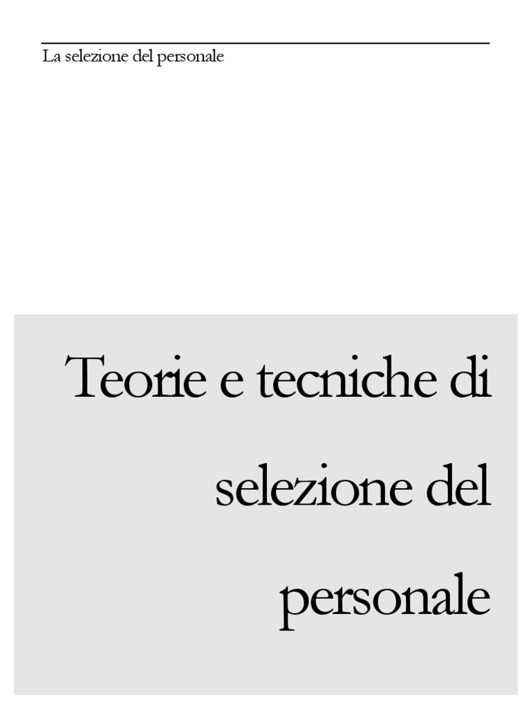 Il termine selezione trova la propria origine in quello latino di selectio, vocabolo che, tradotto, significa scelta. Il processo di selezione si configura, quindi, come una serie di attivit che ha come obiettivo ultimo quello di effettuare una scelta. un processo allinterno del quale si muovono due attori principali individuabili nella figura del selector (colui che sceglie) ed in quella del selectus (colui che scelto). Scegliere, in ambito organizzativo, significa (o dovrebbe significare) assegnare, almeno idealmente, ogni individuo al lavoro pi adatto a lui e alla societ, poich ogni individuo deve poter utilizzare le proprie risorse nel modo migliore per lui e la societ deve fare il migliore uso possibile delle proprie risorse umane. Non sempre questo accade; perch? Spesso, una scarsa attenzione da parte delle aziende al tema dellinvestimento in risorse umane ha prodotto uno scarso interesse per lo sviluppo di procedure che potessero garantire, con un certo livello di probabilit, un discreto grado di validit predittiva delle tecniche utilizzate. Per un certo numero di anni, stata, inoltre, condivisa la convinzione che, in azienda, il focus dei gruppi dirigenti dovesse essere concentrato primariamente sulla qualit e sulla quantit della produzione, fosse essa di beni o di servizi. Oggi, si fa sempre pi strada lopinione che la vera ricchezza dellorganizzazione sia riconducibile alla risorsa umana che in essa si trova ad operare. In riferimento ai beni o ai servizi prodotti, infatti, esistono numerosissime realt aziendali che offrono, con pari livello di quantit e qualit, lo stesso bene materiale o lo stesso servizio. Che cosa, allora, le pu distinguere e rendere realmente competitive nel complesso mercato del lavoro odierno? Idealmente, lo sviluppo delle risorse umane, passa necessariamente in prima istanza