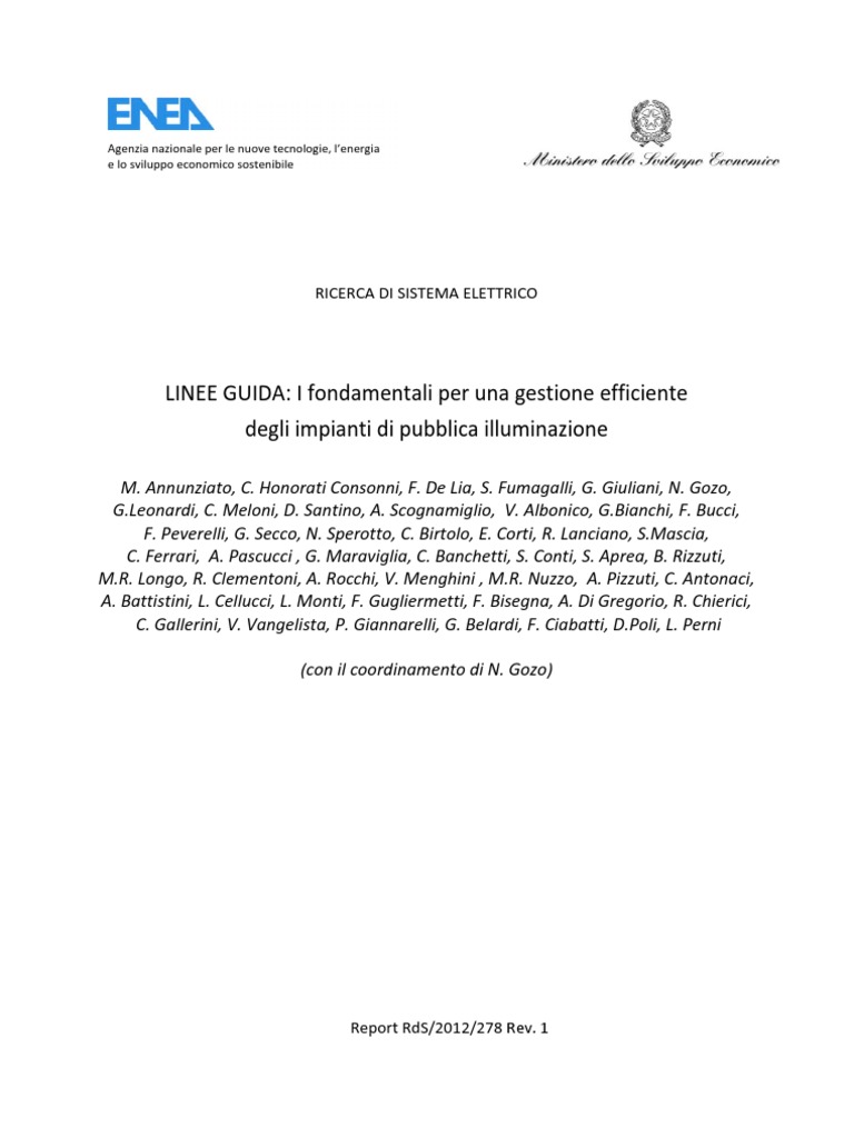LINEE GUIDA: I FONDAMENTALI PER UNA GESTIONE EFFICIENTE DEGLI IMPIANTI DI PUBBLICA ILLUMINAZIONE La redazione del rapporto stata coordinata da Nicoletta Gozo (ENEA). Alla redazione hanno partecipato: ENEA M. Annunziato, C. Honorati Consonni, F. De Lia, S. Fumagalli, G. Giuliani, N. Gozo, G .Leonardi, C. Meloni, D. Santino, A. Scognamiglio AGESI V. Albonico, G. Bianchi, F. Bucci, F. Peverelli, G. Secco, N. Sperotto, C. Birtolo, E. Corti, R. Lanciano, [Link] FEDERESCO C. Ferrari, A. Pascucci , G. Maraviglia, C. Banchetti, S. Conti CONSIP S. Aprea, B. Rizzuti, M.R. Longo, R. Clementoni, A. Rocchi CASSA DEPOSITI E PRESTITI V. Menghini , M.R. Nuzzo, A. Pizzuti MINISTERO SVILUPPO ECONOMICO C. Antonaci MINISTERO AMBIENTE A. Battistini UNIVERSITA DI ROMA LA SAPIENZA DIP. DIAEE L. Cellucci, L. Monti, F. Gugliermetti, F. Bisegna CRIET A. Di Gregorio, R. Chierici EUROSPORTELLO C. Gallerini, V. Vangelista PATTO DEI SINDACI-PROVINCIA DI LA SPEZIA P. Giannarelli MEDIOCREDITO CENTRALE G. Belardi, F. Ciabatti UNIVERSITA DI PISA- [Link] [Link] CET - Societ Consortile Energia Toscana L. Perni
