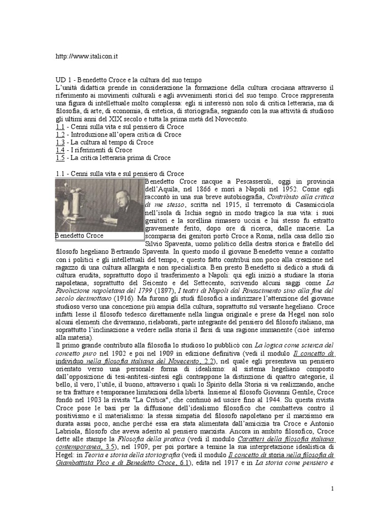 it UD 1 - Benedetto Croce e la cultura del suo tempo Lunit didattica prende in considerazione la formazione della cultura crociana attraverso il riferimento ai movimenti culturali e agli avvenimenti storici del suo tempo. Croce rappresenta una figura di intellettuale molto complessa: egli si interess non solo di critica letteraria, ma di filosofia, di arte, di economia, di estetica, di storiografia, segnando con la sua attivit di studioso gli ultimi anni del XIX secolo e tutta la prima met del Novecento. 1.1 - Cenni sulla vita e sul pensiero di Croce 1.2 - Introduzione allopera critica di Croce 1.3 - La cultura al tempo di Croce 1.4 - I riferimenti di Croce 1.5 - La critica letteraria prima di Croce 1.1 - Cenni sulla vita e sul pensiero di Croce Benedetto Croce nacque a Pescasseroli, oggi in provincia dellAquila, nel 1866 e mor a Napoli nel 1952. Come egli raccont in una sua breve autobiografia, Contributo alla critica di me stesso, scritta nel 1915, il terremoto di Casamicciola nellisola di Ischia segn in modo tragico la sua vita: i suoi genitori e la sorellina rimasero uccisi e lui stesso fu estratto gravemente ferito, dopo ore di ricerca, dalle macerie. La Benedetto Croce scomparsa dei genitori port Croce a Roma, nella casa dello zio Silvio Spaventa, uomo politico della destra storica e fratello del filosofo hegeliano Bertrando Spaventa. In questo modo il giovane Benedetto venne a contatto con i politici e gli intellettuali del tempo, e questo fatto contribu non poco alla creazione nel ragazzo di una cultura allargata e non specialistica. Ben presto Benedetto si dedic a studi di cultura erudita, soprattutto dopo il trasferimento a Napoli: qui egli inizi a studiare la storia napoletana, soprattutto del Seicento e del Settecento, scrivendo alcuni saggi come La Rivoluzione napoletana del 1799 (1897), I teatri di Napoli dal Rinascimento sino alla fine del secolo decimottavo (1916). Ma furono gli studi filosofici a indirizzare lattenzione del giovane studioso verso una concezione pi ampia della cultura, soprattutto sul versante hegeliano. Croce infatti lesse il filosofo tedesco direttamente nella lingua originale e prese da Hegel non solo alcuni elementi che diverranno, rielaborati, parte integrante del pensiero del filosofo italiano, ma soprattutto linclinazione a vedere nella storia il farsi di una ragione immanente (cio interno alla materia). Il primo grande contributo alla filosofia lo studioso lo pubblic con La logica come scienza del concetto puro nel 1902 e poi nel 1909 in edizione definitiva (vedi il modulo Il concetto di individuo nella filosofia italiana del Novecento, 2.2), nel quale egli presentava un pensiero orientato verso una personale forma di idealismo: al sistema hegeliano composto dallopposizione di tesi-antitesi-sintesi egli contrappone la distinzione di quattro categorie, il bello, il vero, lutile, il buono, attraverso i quali lo Spirito della Storia si va realizzando, anche se tra fratture e temporanee limitazioni della libert. Insieme al filosofo Giovanni Gentile, Croce fond nel 1903 la rivista "La Critica", che continu ad uscire fino al 1944. Su questa rivista Croce pose le basi per la diffusione dellidealismo filosofico che combatteva contro il positivismo e il materialismo: la stessa simpatia del filosofo napoletano per il marxismo era durata assai poco, anche perch essa era stata alimentata dallamicizia tra Croce e Antonio Labriola, filosofo che aveva aderito al pensiero marxista. Ancora in ambito filosofico, Croce dette alle stampe la Filosofia della pratica (vedi il modulo Caratteri della filosofia italiana contemporanea, 3.5), nel 1909, per poi portare a temine la sua interpretazione idealistica di Hegel: in Teoria e storia della storiografia (vedi il modulo Il concetto di storia nella filosofia di Giambattista Vico e di Benedetto Croce, 6.1), edita nel 1917 e in La storia come pensiero e