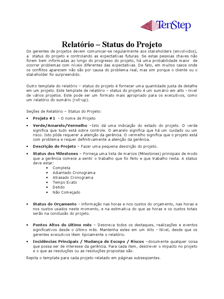 Os gerentes de projetos devem comunicar-se regularmente aos stakeholders (envolvidos), a status do projeto e controlando as expectativas futuras. Se estas pessoas chaves no forem bem informadas ao longo do progresso do projeto, h uma probabilidade maior de ocorrer problemas com nveis diferentes das expectativas. De fato, em muitos casos onde os conflitos aparecem no so por causa do problema real, mas sim porque o cliente ou o stakeholder foi surpreendido. Outro template do relatrio status do projeto fornecer uma quantidade justa de detalhe em um projeto. Este template de relatrio status do projeto um sumrio em alto - nivel de vrios projetos. Este pode ser um formato mais apropriado para os executivos, como um relatrio do sumrio (roll-up). Sees de Relatrio Status do Projeto: Projeto #1 - O nome de Projeto Verde/Amarelo/Vermelho Isto d uma indicao do estado do projeto. O verde significa que tudo est sobre controle. O amarelo significa que h um cuidado ou um risco. Isto pde requerer a ateno da gerncia. O vermelho significa que o projeto est com problema e requer definitivamente a ateno da gerncia. Descrio do Projeto Fazer uma pequena descrio do projeto. Status dos Milestones Fornea uma lista de marcos (Milestones) principais de modo que a gerncia comece a sentir o trabalho que foi feito e que trabalho resta. A status deve estar: Completa Adiantado Cronograma Atrasado Cronograma Tempo Exato Detido No Comeado Status do Oramento - informao nas horas e nos custos do oramento, nas horas e nos custos usados neste momento, e na estimativa do que as horas e os custos totais sero na concluso do projeto. Pontos Altos do ltimo ms Descreva todos os destaques, realizaes e eventos significativos desde o ltimo ms. Mantenha estes em um Alto - Nvel, desde que os gerentes executivos lem tipicamente o relatrio. Incidncias Principais / Mudana de Escopo / Riscos documente qualquer coisa que possa ser de interesse da gerncia. Para cada item, descrever o impacto no projeto e o que as resolues ou as resolues propostas so.
