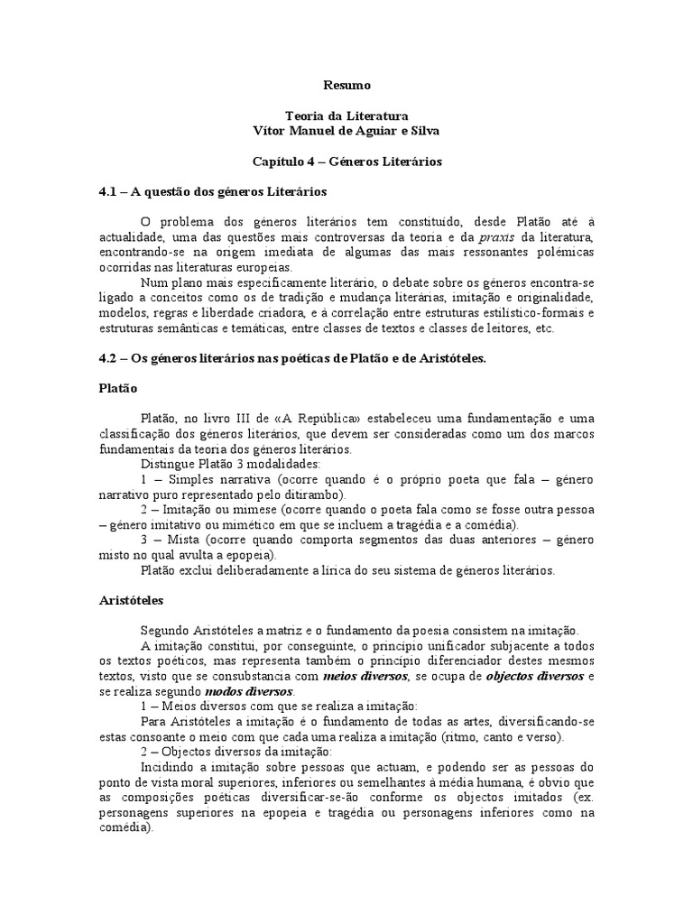 .1 A questo dos gneros Literrios O problema dos gneros literrios tem constitudo, desde Plato at actualidade, uma das questes mais controversas da teoria e da praxis da literatura, encontrando-se na origem imediata de algumas das mais ressonantes polmicas ocorridas nas literaturas europeias. Num plano mais especificamente literrio, o debate sobre os gneros encontra-se ligado a conceitos como os de tradio e mudana literrias, imitao e originalidade, modelos, regras e liberdade criadora, e correlao entre estruturas estilstico-formais e estruturas semnticas e temticas, entre classes de textos e classes de leitores, etc. 4.2 Os gneros literrios nas poticas de Plato e de Aristteles. Plato Plato, no livro III de A Repblica estabeleceu uma fundamentao e uma classificao dos gneros literrios, que devem ser consideradas como um dos marcos fundamentais da teoria dos gneros literrios. Distingue Plato 3 modalidades: 1 Simples narrativa (ocorre quando o prprio poeta que fala gnero narrativo puro representado pelo ditirambo). 2 Imitao ou mimese (ocorre quando o poeta fala como se fosse outra pessoa gnero imitativo ou mimtico em que se incluem a tragdia e a comdia). 3 Mista (ocorre quando comporta segmentos das duas anteriores gnero misto no qual avulta a epopeia). Plato exclui deliberadamente a lrica do seu sistema de gneros literrios. Aristteles Segundo Aristteles a matriz e o fundamento da poesia consistem na imitao. A imitao constitui, por conseguinte, o princpio unificador subjacente a todos os textos poticos, mas representa tambm o princpio diferenciador destes mesmos textos, visto que se consubstancia com meios diversos, se ocupa de objectos diversos e se realiza segundo modos diversos. 1 Meios diversos com que se realiza a imitao: Para Aristteles a imitao o fundamento de todas as artes, diversificando-se estas consoante o meio com que cada uma realiza a imitao (ritmo, canto e verso). 2 Objectos diversos da imitao: Incidindo a imitao sobre pessoas que actuam, e podendo ser as pessoas do ponto de vista moral superiores, inferiores ou semelhantes mdia humana, obvio que as composies poticas diversificar-se-o conforme os objectos imitados (ex. personagens superiores na epopeia e tragdia ou personagens inferiores como na comdia).