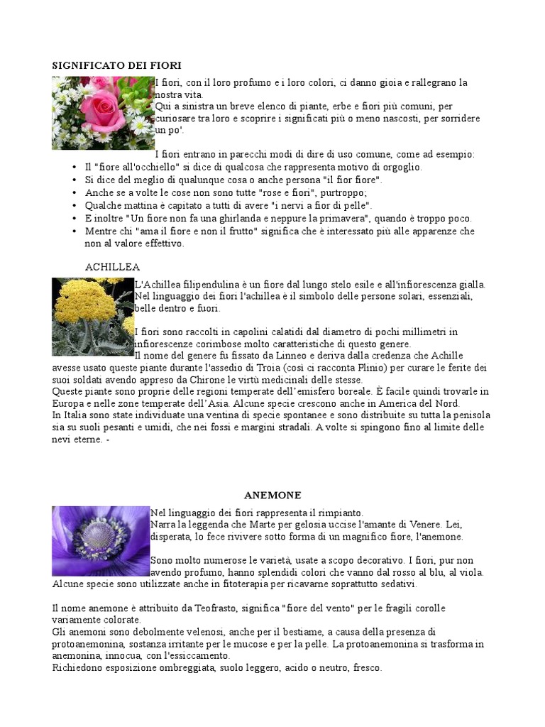 Qui a sinistra un breve elenco di piante, erbe e fiori pi comuni, per curiosare tra loro e scoprire i significati pi o meno nascosti, per sorridere un po'. I fiori entrano in parecchi modi di dire di uso comune, come ad esempio: Il "fiore all'occhiello" si dice di qualcosa che rappresenta motivo di orgoglio. Si dice del meglio di qualunque cosa o anche persona "il fior fiore". Anche se a volte le cose non sono tutte "rose e fiori", purtroppo; Qualche mattina capitato a tutti di avere "i nervi a fior di pelle". E inoltre "Un fiore non fa una ghirlanda e neppure la primavera", quando troppo poco. Mentre chi "ama il fiore e non il frutto" significa che interessato pi alle apparenze che non al valore effettivo. ACHILLEA L'Achillea filipendulina un fiore dal lungo stelo esile e all'infiorescenza gialla. Nel linguaggio dei fiori l'achillea il simbolo delle persone solari, essenziali, belle dentro e fuori. I fiori sono raccolti in capolini calatidi dal diametro di pochi millimetri in infiorescenze corimbose molto caratteristiche di questo genere. Il nome del genere fu fissato da Linneo e deriva dalla credenza che Achille avesse usato queste piante durante l'assedio di Troia (cos ci racconta Plinio) per curare le ferite dei suoi soldati avendo appreso da Chirone le virt medicinali delle stesse. Queste piante sono proprie delle regioni temperate dellemisfero boreale. facile quindi trovarle in Europa e nelle zone temperate dellAsia. Alcune specie crescono anche in America del Nord. In Italia sono state individuate una ventina di specie spontanee e sono distribuite su tutta la penisola sia su suoli pesanti e umidi, che nei fossi e margini stradali. A volte si spingono fino al limite delle nevi eterne. -