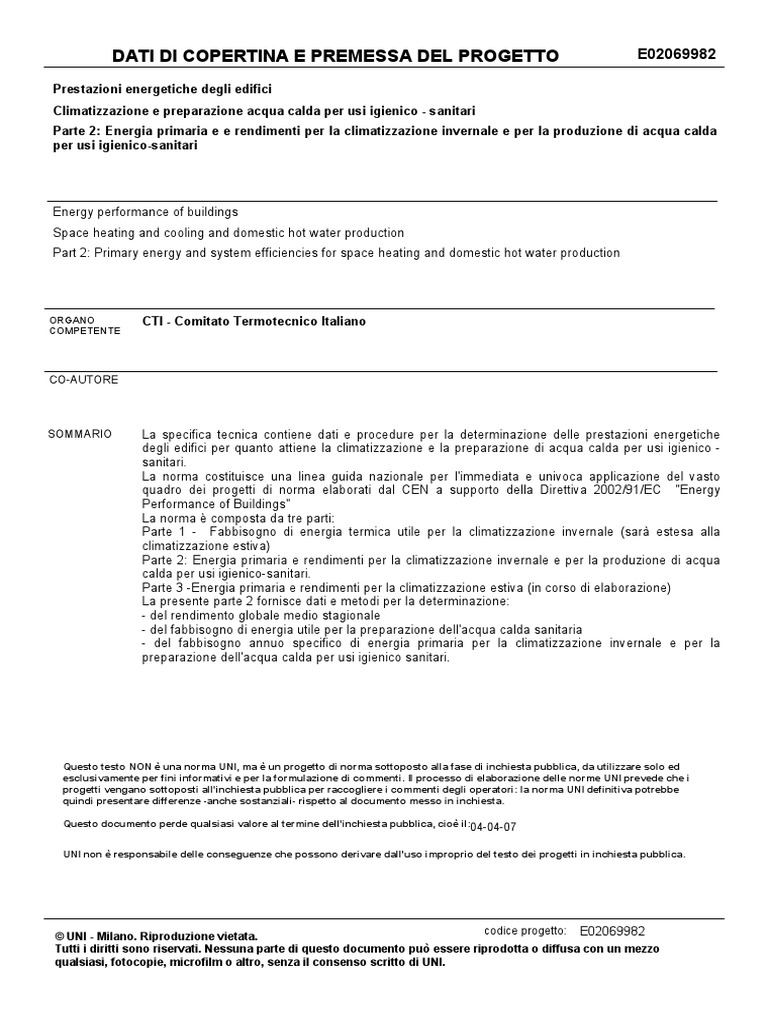 Questo testo NON una norma UNI, ma un progetto di norma sottoposto alla fase di inchiesta pubblica, da utilizzare solo ed esclusivamente per fini informativi e per la formulazione di commenti. Il processo di elaborazione delle norme UNI prevede che i progetti vengano sottoposti all'inchiesta pubblica per raccogliere i commenti degli operatori: la norma UNI definitiva potrebbe quindi presentare differenze -anche sostanziali- rispetto al documento messo in inchiesta. Questo documento perde qualsiasi valore al termine dell'inchiesta pubblica, cio il:04-04-07 UNI non responsabile delle conseguenze che possono derivare dall'uso improprio del testo dei progetti in inchiesta pubblica.