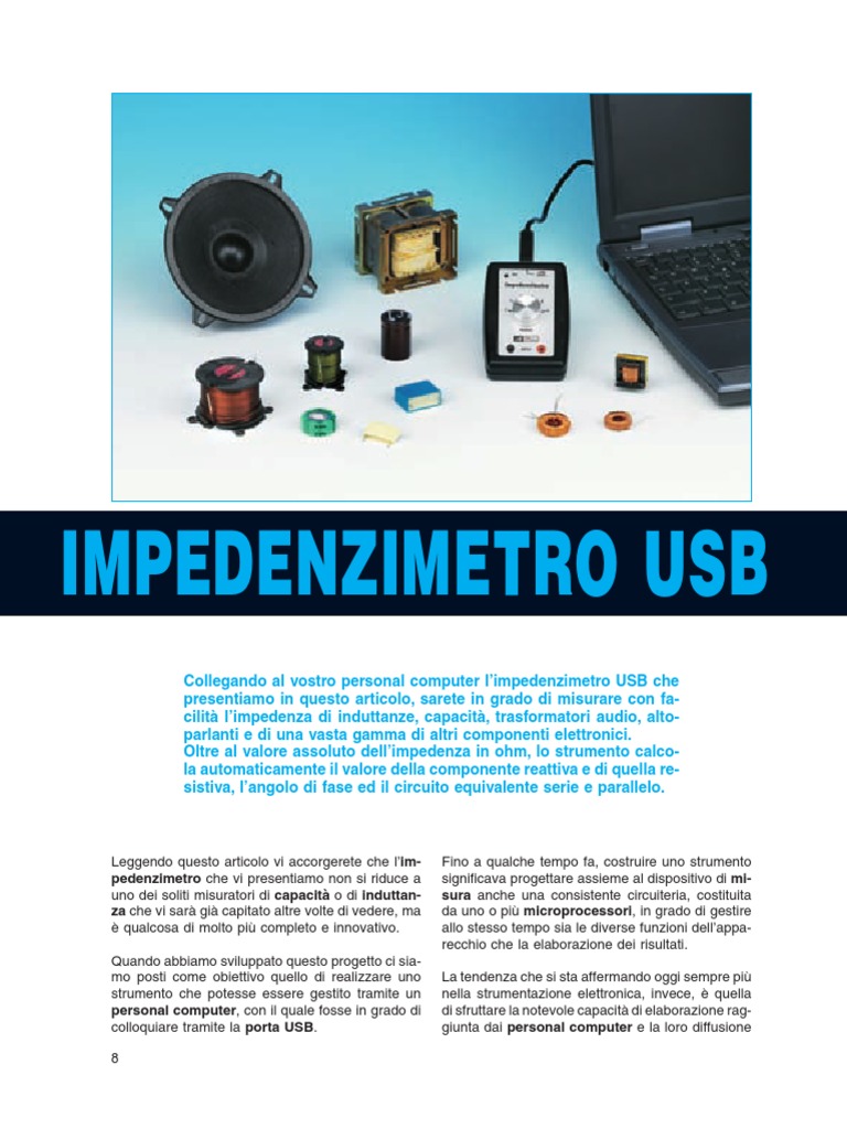 Collegando al vostro personal computer limpedenzimetro USB che presentiamo in questo articolo, sarete in grado di misurare con facilit limpedenza di induttanze, capacit, trasformatori audio, altoparlanti e di una vasta gamma di altri componenti elettronici. Oltre al valore assoluto dellimpedenza in ohm, lo strumento calcola automaticamente il valore della componente reattiva e di quella resistiva, langolo di fase ed il circuito equivalente serie e parallelo.