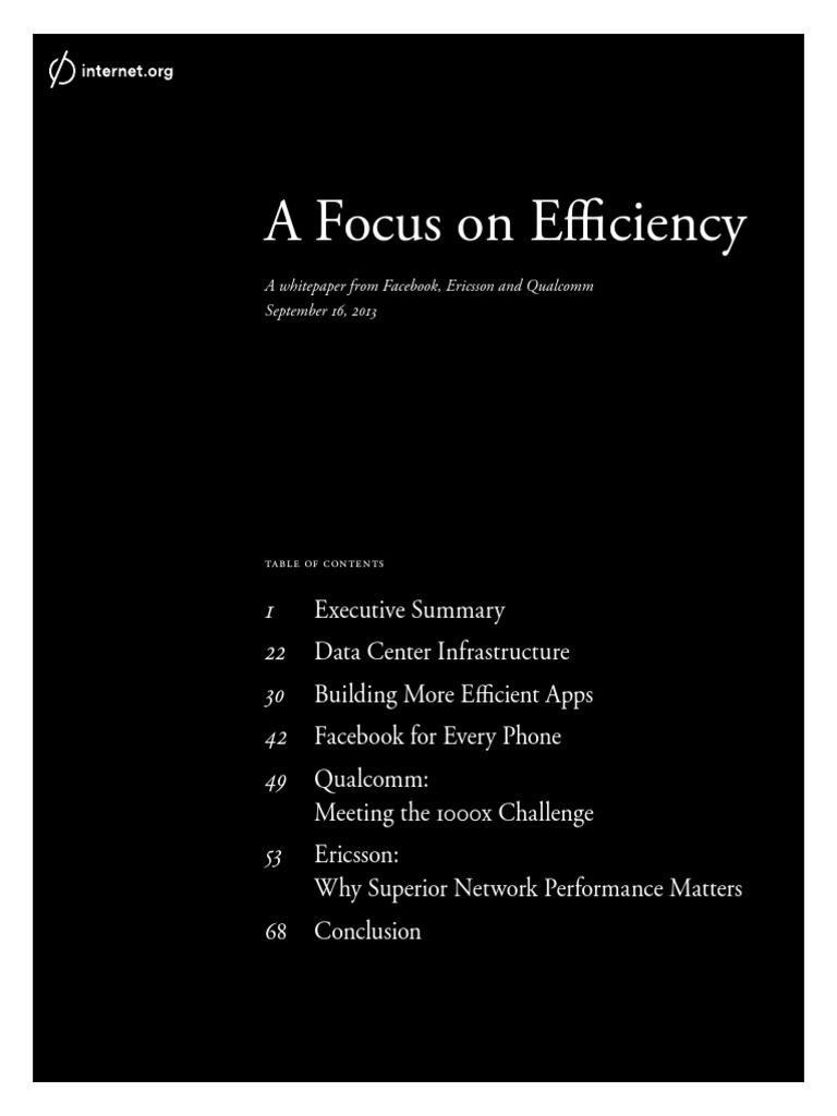 The second half of this paper features contributions from Internet.org partners Qualcomm and Ericsson that look to the future. To ensure that telecommunica- tions and technology leaders are ready for the next five billion people, building more efficient networks will be vital. In chapter 5, Qualcomm presents an over- view of the “1000x initiative,” a plan to expand global wireless capacity by 1000 times. In chapter 6, Ericsson explores how achieving superior network perfor- mance lies at the heart of operator best practices today as global smartphone penetration achieves critical mass.