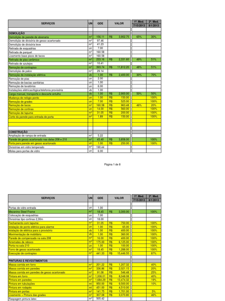 Portas de vidro entrada Mezanino Steel Frame Colocao de esquadrias Divisrias tipo cortinas 2,30m Fechamento com tapume Istalao de ponto eltrico para alarme Istalao de eltrica para o provisrio Movimentao de mobilirio Parede de compensado na sala 208 Arremates de reboco Porta na sala 210 Forro de gesso acartonado Execuo de contrapiso PINTURAS E REVESTIMENTOS Massa corrida em forro Massa corrida em paredes Massa corrida em paredes de gesso acartonado Pintura em forro Pintura em paredes Pintura em tubulaes Pintura em rodaps Pintura em portas Lixamento + Pintura das grades Raspagem pintura latex Raspagem pintura a leo Selador para paredes internas Massa corrida Cor laranja referncia flor capuchinha suvinil Cor caf com leite referncia J 154 suvinil Pintura paredes e forro branco puro Pintura em esquadrias de madeira