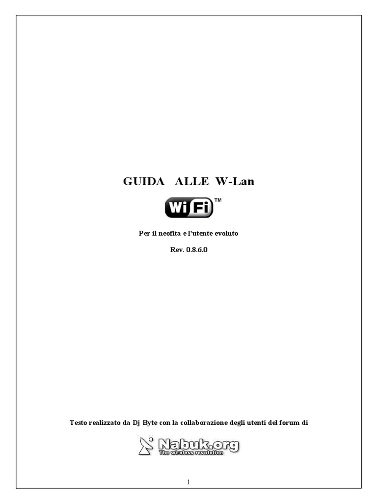 Lavorare o navigare senza meta nell'infinit di internet, comodamente seduti sulla poltrona o sul divano di casa, sdraiati a prendere il sole nel giardino in una bella giornata estiva, non pi mera fantasia. La comodit di una rete senza fili ha numerosi vantaggi ma, come tutte le cose, esistono anche alcuni aspetti negativi che devono essere presi in considerazione, onde evitare spiacevoli conseguenze. Con il diffondersi ed il calare del costo d'acquisto degli apparati Wi-Fi, molte persone hanno iniziato a sperimentare l'utilizzo di access point apportando modifiche hardware, estendendo la propria rete casalinga. Gruppi di amici si uniscono tra loro creando celle di reti piuttosto ampie, dove risorse e passioni comuni si uniscono in un'unica entit. Grazie agli appassionati, si assiste al passaggio all'uso esterno di apparati che sono nati per un uso interno alla propria abitazione. Questa guida nasce da una passione personale, frutto di molte ore passate a sperimentare e di estenuanti ricerche in internet, spesso infruttuose; non vuole essere una sorta di testo definitivo sulle reti senza fili ma una risposta alle molte domande e perplessit che un utente alle prime armi si pone, aiutandolo a capire i fondamenti, le difficolt e la risoluzione dei problemi d'installazione e gestione iniziale di questa tecnologia; non si vuole trascurare nemmeno l'utente evoluto che vuole ottenere il massimo dai suoi apparati con realizzazioni al limite della fantasia e della tecnica. Credendo nella libert di parola ed espressione, nell'aiuto reciproco, nella divulgazione della conoscenza e nell'open source, questa giuda resa disponibile a tutti secondo la licenza pubblica generale (GPL), modificabile, integrabile, traducibile in ogni lingua e stampabile infinite volte, indicando sempre l'autore o gli autori del progetto di base. Un ringraziamento particolare rivolto agli utenti del forum di [Link] e dei LUG (Linux User Group) italiani, che hanno prestato la loro assistenza e competenza, correggendo alcuni bug di questa guida. Dj Byte