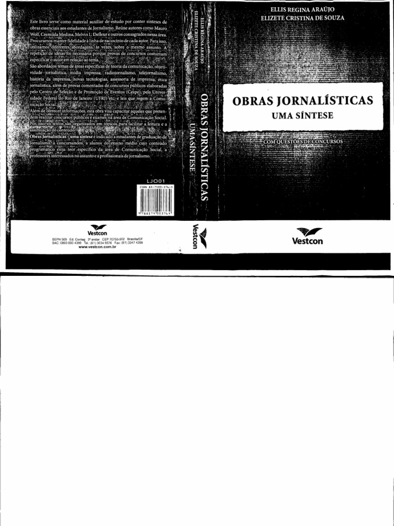 2008 Vestcon Editora Ltda. Todos os direitos autorais desta obra so reservados e protegidos pela Lei nO 9.610, de 19/2/1998. Proibida a reproduo de qualquer parte deste livro, sem autorizao prvia expressa por escrito do autor e da editora, por quaisquer meios empregados, sejam eletrnicos, mecnicos, videogr ficos, fonogrficos, reprogrficos, microflmicos, fotogrficos, grficos ou outros. Essas proibies aplicam-se tambm editorao da obra, bem como s suas caractersticas grficas. Arajo, Ellis Regina. Obras jornalsticas: uma sntese. Ellis Regina Arajo, Elizete Cristina de Souza. - 3. ed. - Braslia: Vestcon, 2008. 558 p. ; 21 em. ISBN 85-7400-376-X 1. Comunicao SociaL 2. Jornalismo. 1.Souza, Elizete Cristina de. lI. Ttulo. CDD070 DIRETORIA EXECUTIVA Norma Suely A. P. Pimentel DIREO DE PRODUO Cludia Alcntara Prego de Arajo SUPERVISO DE PRODUO Carla Cunha SUPERVISO EDITORIAL Maria Neves EDITORAO ELETRNICA Daniel dos Santos Sampaio REVISO Aline Silva Arajo CAPA Agnel0 Pacheco Bertoni Design