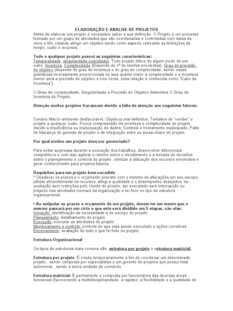 . O Projeto um processo formado por um grupo de atividades que so coordenadas e controladas com datas de inicio e fim, visando atingir um objetivo tendo como aspecto relevante as limitaes de tempo, custo e recursos. Todo e qualquer projeto possui as seguintes caractersticas: Temporalidade, singularidade (unicidade): Todo projeto difere de algum modo de um outro, Incerteza, Complexidade (Depende do n de tarefas envolvidas), Grau de preciso do objetivo (depende do grau de incerteza e do grau de complexidade, sendo essas grandezas inversamente proporcionais ou seja quanto maior a complexidade e a incerteza menor ser a preciso do objetivo e vice versa, essa relao conhecida como Cubo da Incerteza). O Grau de complexidade, Singularidade e Preciso do Objetivo determina O Grau de Incerteza do Projeto. Ateno muitos projetos fracassam devido a falta de ateno aos seguintes fatores: Cenrio Macro-ambiente desfavorvel, Objetivos mal definidos, Tentativa de vender o projeto a qualquer custo, Pouca compreenso da incerteza e complexidade do projeto devido a insuficincia ou inadequao de dados, Controle e treinamento inadequado, Falta de liderana do gerente de projeto e de integrao entre as reas-chave do projeto. Por qual motivo um projeto deve ser gerenciado? Para evitar surpresas durante a execuo dos trabalhos, desenvolver diferenciais competitivos e com isso agilizar o retorno sobre o investimento e a tomada de decises sobre o planejamento e controle do projeto, otimizar a utilizao dos recursos envolvidos e gerar conhecimento para projetos futuros. Requisitos para um projeto bem sucedido * Obedecer os prazos e o oramento previsto com o mnimo de alteraes em seu escopo, utilizar eficientemente os recursos, atingi a qualidade e o desempenho desejados; ter aceitao sem restries pelo cliente do projeto; ser executado sem interrupo ou prejuzo nas atividades normais da organizao e ter foco no tipo de estrutura organizacional. Ao estipular os prazos e oramento de um projeto, devem ter em mente que o mesmo passar por um ciclo e que este ser dividido em 5 etapas, so elas: Iniciao: identificao da necessidade e do escopo do projeto Planejamento: detalhamento do projeto Execuo: executar as atividades do projeto Monitoramento e controle: controle do que est sendo executado e aes corretivas Encerramento: avaliao de tudo o que foi feito no projeto Estrutura Organizacional Os tipos de estruturas mais comuns so: estrutura por projeto e estrutura matricial. Estrutura por projeto: criada temporariamente a fim de coordenar um determinado projeto , sendo composta por especialistas e um gerente de projetos que possui total autonomia , sendo a nica unidade de comando. Estrutura matricial: permanente e composta por funcionrios das diversas reas funcionais (favorecendo a multidisciplinaridade, a rapidez, a flexibilidade e a qualidade do