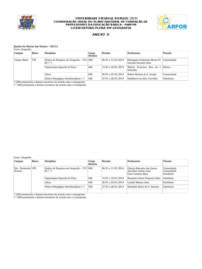 Quadro de Ofertas das Turmas – 2013.2 Curso: Geografia