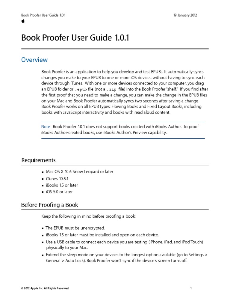 Note: Book Proofer 1.0.1 does not support books created with iBooks Author. To proof iBooks Author-created books, use iBooks Author’s Preview capability.
