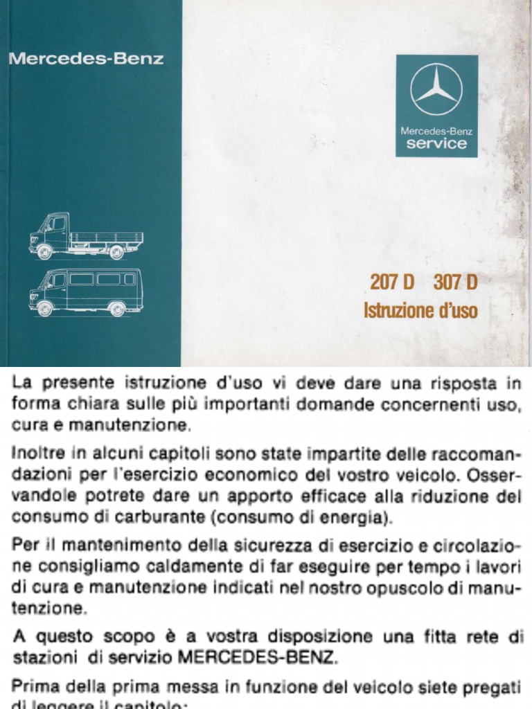 La presente istruzione d'uso vi deve dare una risposta in forma chiara sulle pi importanti domande concernenti uso, cura e manutenzione. Inoltre in alcuni capitoli sono state impartite delle raccomandazioni per l'esercizio economico del vostro veicolo. Osservandole potrete dare un apporto efficace alla riduzione del consumo di carburante (consumo di energia). Per il mantenimento della sicurezza di esercizio e circolazione consigliamo caldamente di far eseguire per tempo i lavori di cura e manutenzione indicati nel nostro opuscolo di manutenzione. A questo scopo a vostra disposizione una fitta rete di stazioni di servizio MERCEDES-BENZ. Prima della prima messa in funzione del veicolo siete pregati di leggere il capitolo: Uso del veicolo. In questa istruzione d'uso sono stati inclusi pi prototipi che sono analoghi per ci che riguarda i componenti di base. Inoltre sono stati tenuti presenti molti equipaggiamenti speciali, per cui l'esecuzione del vostro veicolo si pu differenziare in alcune descrizioni ed illustrazioni. Ed ora, buon viaggio! Daimler-Benz Aktiengesellschaft