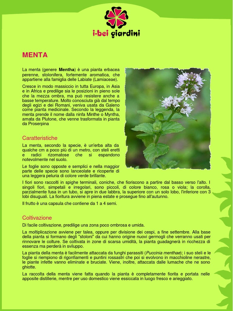 La menta (genere Mentha) una pianta erbacea perenne, stolonifera, fortemente aromatica, che appartiene alla famiglia delle Labiate (Lamiaceae). Cresce in modo massiccio in tutta Europa, in Asia e in Africa e predilige sia le posizioni in pieno sole che la mezza ombra, ma pu resistere anche a basse temperature. Molto conosciuta gi dal tempo degli egizi e dei Romani, veniva usata da Galeno come pianta medicinale. Secondo la leggenda, la menta prende il nome dalla ninfa Minthe o Myntha, amata da Plutone, che venne trasformata in pianta da Proserpina
