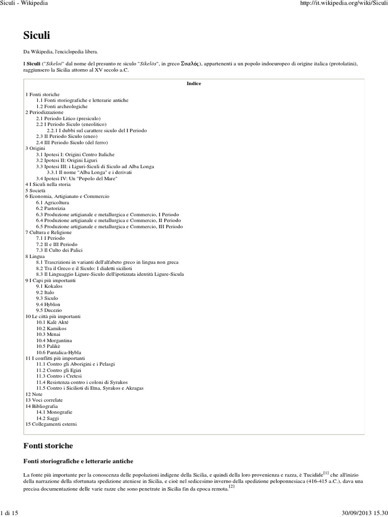 Indice 1 Fonti storiche 1.1 Fonti storiografiche e letterarie antiche 1.2 Fonti archeologiche 2 Periodizzazione 2.1 Periodo Litico (presiculo) 2.2 I Periodo Siculo (eneolitico) 2.2.1 I dubbi sul carattere siculo del I Periodo 2.3 II Periodo Siculo (eneo) 2.4 III Periodo Siculo (del ferro) 3 Origini 3.1 Ipotesi I: Origini Centro Italiche 3.2 Ipotesi II: Origini Liguri 3.3 Ipotesi III: i Liguri-Siculi di Siculo ad Alba Longa 3.3.1 Il nome "Alba Longa" e i derivati 3.4 Ipotesi IV: Un "Popolo del Mare" 4 I Siculi nella storia 5 Societ 6 Economia, Artigianato e Commercio 6.1 Agricoltura 6.2 Pastorizia 6.3 Produzione artigianale e metallurgica e Commercio, I Periodo 6.4 Produzione artigianale e metallurgica e Commercio, II Periodo 6.5 Produzione artigianale e metallurgica e Commercio, III Periodo 7 Cultura e Religione 7.1 I Periodo 7.2 II e III Periodo 7.3 Il Culto dei Palici 8 Lingua 8.1 Trascrizioni in varianti dell'alfabeto greco in lingua non greca 8.2 Tra il Greco e il Siculo: I dialetti sicilioti 8.3 Il Linguaggio Ligure-Siculo dell'ipotizzata identit Ligure-Sicula 9 I Capi pi importanti 9.1 Kokalos 9.2 Italo 9.3 Siculo 9.4 Hyblon 9.5 Ducezio 10 Le citt pi importanti 10.1 Kal Akt 10.2 Kamikos 10.3 Menai 10.4 Morgantina 10.5 Palik 10.6 Pantalica-Hybla 11 I conflitti pi importanti 11.1 Contro gli Aborigini e i Pelasgi 11.2 Contro gli Egizi 11.3 Contro i Cretesi 11.4 Resistenza contro i coloni di Syrakos 11.5 Contro i Sicilioti di Etna, Syrakos e Akragas 12 Note 13 Voci correlate 14 Bibliografia 14.1 Monografie 14.2 Saggi 15 Collegamenti esterni