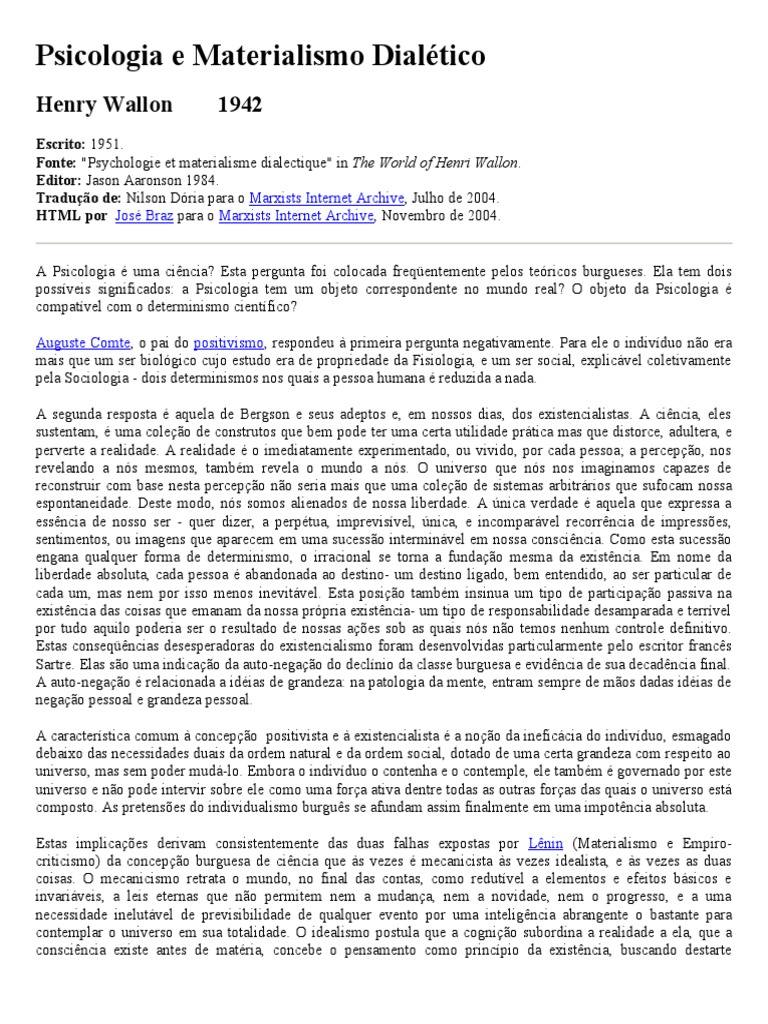 condicionada pelas situaes nas quais est engajada, estejam elas de acordo com suas prprias tendncias ou contrrias a elas. As relaes entre o organismo e o ambiente so ainda mais enriquecidas pelo fato do prprio ambiente no ser imutvel. Uma mudana no ambiente pode resultar ou na extino ou na transformao dos organismos que existem em seu interior. Ento, se torna o papel dos diversos ambientes, na medida de suas diferenas, evocar ou trazer tona capacidades inatas diferentes, j potencialmente presentes, em uma espcie ou em indivduos. Assim, na histria do gnero humano a sucesso de diferentes civilizaes deu origem s diversas formas de atividade. O materialismo histrico expande e coroa o materialismo de dialtico. Transformando suas condies de vida, o homem se transforma. As tcnicas modernas, para serem entendidas, desenvolvidas, e, freqentemente, at mesmo aplicadas, requerem um conhecimento de frmulas abstratas, sistemas simblicos nos quais as imagens perceptuais do mundo real so substitudas por pistas que designam operaes a serem executadas ao nvel do que Pavlov nomeou segundo sistema de sinais - sistema no qual o sinal ou estmulo condicionado no mais uma sensao, mas a palavra, e os substitutos ainda mais abstratos para as prprias palavras: os smbolos matemticos. Na atividade humana a linguagem serviu como o instrumento de uma transformao que modificou gradualmente a fala que passou de uma atividade puramente muscular para uma atividade terica, requerendo uma reorganizao das operaes cerebrais. Isto no significa, contudo, que o novo tipo atividade substituiu o primeiro. Atravs da linguagem, a esfera conceitual adquiriu organizao e estrutura baseadas em sistemas estveis, coerentes, e lgicos. Nossas impresses e aes em sua maior parte encaminham-se para, ou procedem desta esfera. Mas embora as governe, no as abole. Sob a dimenso conceitual (representacional) do pensamento ainda se encontram os gestos e as aes que parecem caracterizar o pensamento representacional em crianas ou em deficientes mentais, e que supre o pensamento representacional de seus primeiros contornos primrios na forma de rituais ou ritos (Wallon 1942). Os rituais de povos primitivos normalmente utilizam tremendos recursos emocionais que so dissipados quando a imagem intelectual emerge em seu lugar. A reflexo intelectual refreia a agitao emocional. Mas a emocionalidade persiste. Quando mantida dentro de seus limites, pode agir como um estimulante; mas quando assume o controle restringe ou distorce a reflexo. Assim, essas atividades opostas entram em conflito, apesar de uma sempre poder dar origem outra. Estas afinidades e oposies so consoantes com as leis da dialtica Marxista. Foi a dialtica que forneceu Psicologia sua estabilidade e seu significado, e que a libertou de ter de optar entre o materialismo elementar ou o idealismo choco, o substancialismo cru ou o irracionalismo desesperado. Com o auxlio da dialtica a Psicologia pode ser simultaneamente uma cincia natural e uma cincia humana, abolindo a diviso entre a conscincia e as coisas que o espiritualismo buscou impor ao universo. A Dialtica Marxista permitiu Psicologia compreender o organismo e seu ambiente em interao constante, como uma totalidade unificada. E finalmente, na Dialtica Marxista, a Psicologia encontra uma ferramenta para explicar os conflitos nos quais o indivduo tem que evoluir seu comportamento e desenvolver sua personalidade. A Psicologia de forma alguma est sozinha nesse respeito. O Materialismo de Dialtico pertinente a todo domnio de conhecimento, como tambm a todo domnio de ao. Mas a Psicologia, a fonte principal das iluses antropomrficas e metafsicas, deve, mais que qualquer outra cincia, encontrar no materialismo dialtico sua base e princpios-guia.
