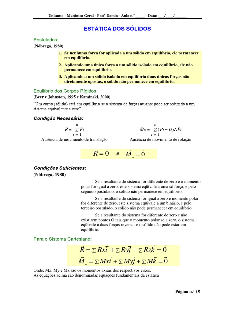 Onde; Mx, My e Mz so os momentos axiais dos respectivos eixos. As equaes acima so denominadas equaes fundamentais da esttica