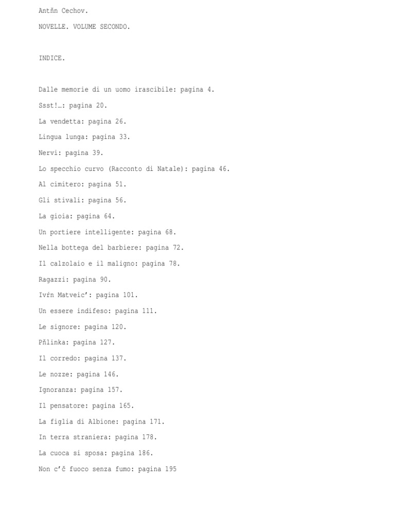 Dalle memorie di un uomo irascibile: pagina 4. Ssst!: pagina 20. La vendetta: pagina 26. Lingua lunga: pagina 33. Nervi: pagina 39. Lo specchio curvo (Racconto di Natale): pagina 46. Al cimitero: pagina 51. Gli stivali: pagina 56. La gioia: pagina 64. Un portiere intelligente: pagina 68. Nella bottega del barbiere: pagina 72. Il calzolaio e il maligno: pagina 78. Ragazzi: pagina 90. Ivn Matveic: pagina 101. Un essere indifeso: pagina 111. Le signore: pagina 120. Plinka: pagina 127. Il corredo: pagina 137. Le nozze: pagina 146. Ignoranza: pagina 157. Il pensatore: pagina 165. La figlia di Albione: pagina 171. In terra straniera: pagina 178. La cuoca si sposa: pagina 186. Non c fuoco senza fumo: pagina 195