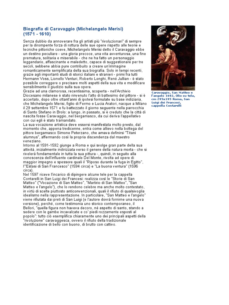 Senza dubbio da annoverare fra gli artisti pi "rivoluzionari" di sempre per la dirompente forza di rottura delle sue opere rispetto alle teorie e tecniche pittoriche coeve, Michelangelo Merisi detto il Caravaggio ebbe un destino peculiare - una gloria precoce, una vita avventurosa, una fine prematura, solitaria e miserabile - che ne ha fatto un personaggio leggendario, affascinante e maledetto, capace di suggestionare per tre secoli, sebbene abbia pure contribuito a creare un'immagine romanticamente semplificata della sua biografia. Solo in tempi recenti, grazie agli importanti studi di storici italiani e stranieri - primi fra tutti Hermann Voss, Lionello Venturi, Roberto Longhi, Ren Jullian - stato possibile correggere o precisare molti aspetti della sua vita e modificare sensibilmente il giudizio sulla sua opera. Grazie ad una clamorosa, recentissima, scoperta - nell'Archivio Diocesano milanese stato rinvenuto l'atto di battesimo del pittore - si accertato, dopo oltre ottant'anni di ipotesi formulate su base indiziaria, che Michelangelo Merisi, figlio di Fermo e Lucia Aratori, nacque a Milano il 29 settembre 1571 e fu battezzato il giorno seguente nella parrocchia di Santo Stefano in Brolo: a lungo, in passato, si creduto che la citt di nascita fosse Caravaggio, nel bergamasco, da cui deriva l'appellativo con cui egli stato tramandato. La sua vocazione artistica deve essersi manifestata molto presto, dal momento che, appena tredicenne, entra come allievo nella bottega del pittore bergamasco Simone Peterzano, che amava definirsi "Titani alumnus", affermando cos la propria discendenza dal maestro veneziano. Intorno al 1591-1592 giunge a Roma e qui svolge gran parte della sua attivit, inizialmente indirizzata verso il genere della natura morta - che si riveler fondamentale in tutta la sua pittura -, quindi, in seguito alla conoscenza dell'influente cardinale Del Monte, rivolta ad opere di maggior impegno e spessore quali il "Riposo durante la fuga in Egitto", l'"Estasi di San Francesco" (1594 circa) e "La buona ventura" (1596 circa). Nel 1597 riceve l'incarico di dipingere alcune tele per la cappella Contarelli in San Luigi dei Francesi: realizza cos le "Storie di San Matteo" ("Vocazione di San Matteo", "Martirio di San Matteo", "San Matteo e l'angelo"), che lo rendono celebre ma anche molto contestato, in virt di scelte piuttosto anticonvenzionali, quali il rifiuto di qualsivoglia idealismo nella rappresentazione. In particolare, "San Matteo e l'angelo" viene rifiutata dai preti di San Luigi (e l'autore dovr fornirne una nuova versione), perch, come testimonia uno storico contemporaneo, il Bellori, "quella figura non haveva decoro, n aspetto di santo, stando a sedere con le gambe incavalcate e co' piedi rozzamente esposti al popolo": tutto ci esemplifica chiaramente uno dei principali aspetti della "rivoluzione" caravaggesca, ovvero il rifiuto della tradizionale identificazione di bello con buono, di brutto con cattivo.
