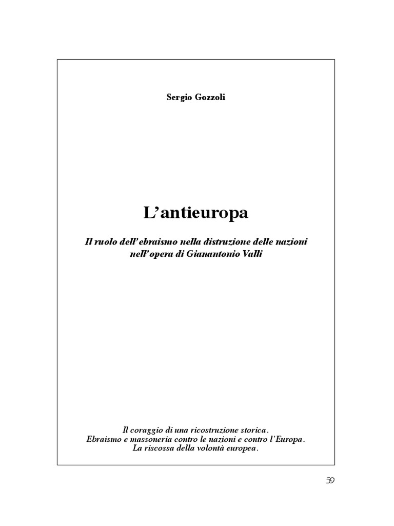 lessicalismo accusatorio appare aver gettato lEuropa in una povera funzione servile sotto dispotici padroni dominanti. Gianantonio Valli guarda a tutto questo dallalto, e lo osserva col distacco del furor philosophicus, anche se non si pu non rilevare, nel suo profondo, la consapevole sofferenza del vinto. Egli vede le mai smarrite cause remote, e la lunga, secolare preparazione; vede lilluminismo, e il deismo, e la nascita delle banche internazionali; vede la comparsa della cartamoneta e la sua conquista del potere in Inghilterra, ed il sorgere della Massoneria col suo rapido diffondersi tentacolare nel mondo; vede le Rivoluzioni americana e francese, il sogno napoleonico, il crescere della potenza inglese e il suo dominio dispotico dei mari; vede il progressivo dilatarsi della forza nordamericana di fronte alliniziale declino del potere britannico, mentre negli Stati Uniti si accresce in numero e in ricchezza una folta colonia giudaica proveniente dalla Germania prima e poi dalloriente europeo a precedere i banchieri che giungeranno da Gran Bretagna, Germania e Svizzera; vede lestendersi dellUsura bancaria agli USA col nascere del Federal Reserve System, prima banca centrale americana privata che produce dollari e li presta allo Stato per interesse, come le banche centrali dInghilterra, di Francia, di Germania; e infine vede le due smisurate Guerre Mondiali che han dilacerato e impoverito lEuropa, vinte dalle demoplutocrazie occidentali col concorso finale degli USA, che calpestano per la prima volta lEuropa con le proprie truppe nel primo conflitto e che la occupano, insieme al Giappone e ad alcuni Paesi arabi, per non andarsene mai pi dopo il secondo conflitto: limpero degli anglosassoni sullEuropa, guidati dai banchieri giudeocalvinisti alla conquista di un intero mondo gi anglofono. Valli vede queste lunghe vicende storiche, con gli attuali conflitti che completano la Seconda Guerra Mondiale fino al Tempo Ultimo che, in onta al declino americano recente, quello di un mondialismo che sembra avviato al potere. E guarda a questi eventi con lo stacco sofferto del furor philosophicus. Ma io, che questi eventi li ho vissuti e patiti col furor politicus di chi ha fatto una guerra e lha perduta, e che continua ancor oggi a perderla una guerra che ho cominciato a 13 anni e di cui ora, a 81, non riesco a intravvederne la fine non mi sento di concordare con lui fino in fondo. Cominciamo dal titolo del libro: La fine dellEuropa. Nulla, nella storia, gi stato scritto. Il nostro continente oggi soggiogato dagli anglosassoni e dagli ebrei, che ne controllano le finanze, che ne dominano i mari, che gli impongono la loro cultura. Ma gli europei, che sono latini, germanici, slavi, celti, baltici, ugroturchi, illiri, greci, baschi, georgiani, armeni, fino a quando tollereranno questo giogo senza ribellarsi? A parte la classe dirigente attuale, rieducata, massonizzata e giudaizzata, quanto a lungo i popoli subiranno linsopportabile peso di questa Usura bancaria che ci obbliga a pagare col nostro lavoro il gran debito degli Stati Uniti, che continuano a riarmarsi col denaro altrui? Che continuano a campare, ad elevati livelli di vita, con prestiti che non si sa ancora se e quando verranno restituiti? Vi sono ancora, in Europa, popoli che vivono in pienezza di libert, di compattezza, di una propria antica civilt che ripudia i gay e la famiglia arcoba72
