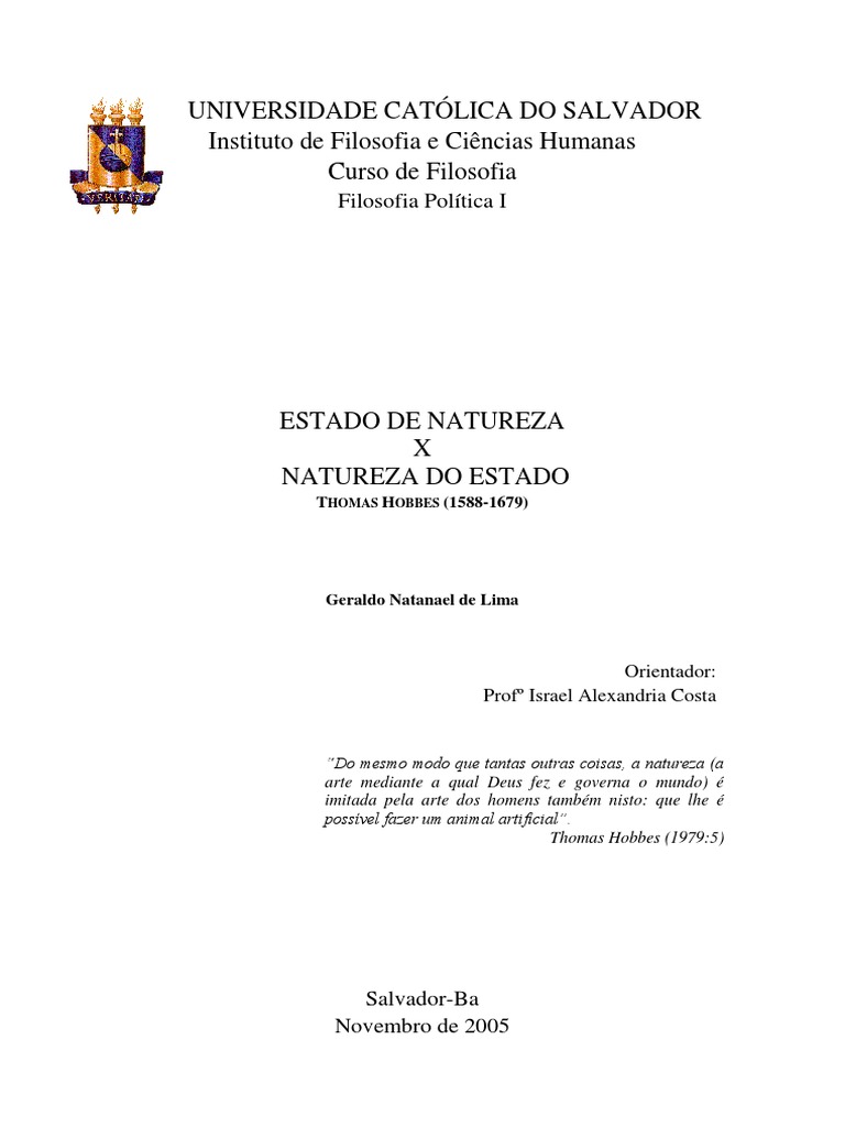 Este trabalho foi elaborado com base no livro de Thomas Hobbes da coleo Os Pensadores, que foi utilizado como pilar fundamental do nosso trabalho. Abordaremos tambm algumas idias, comentrios e associaes do Professor Israel de Alexandria, fragmentos de outros livros e de uma pesquisa realizada na Internet que constam da nossa bibliografia. Teremos como objetivo a elaborao de um trabalho que representar uma sntese das diversas fontes utilizadas, sendo que no seremos rigorosos no critrio da metodologia da pesquisa cientfica. Teremos como fim, a busca de uma resposta para a questo da distino entre estado da natureza e a natureza do Estado em Hobbes.