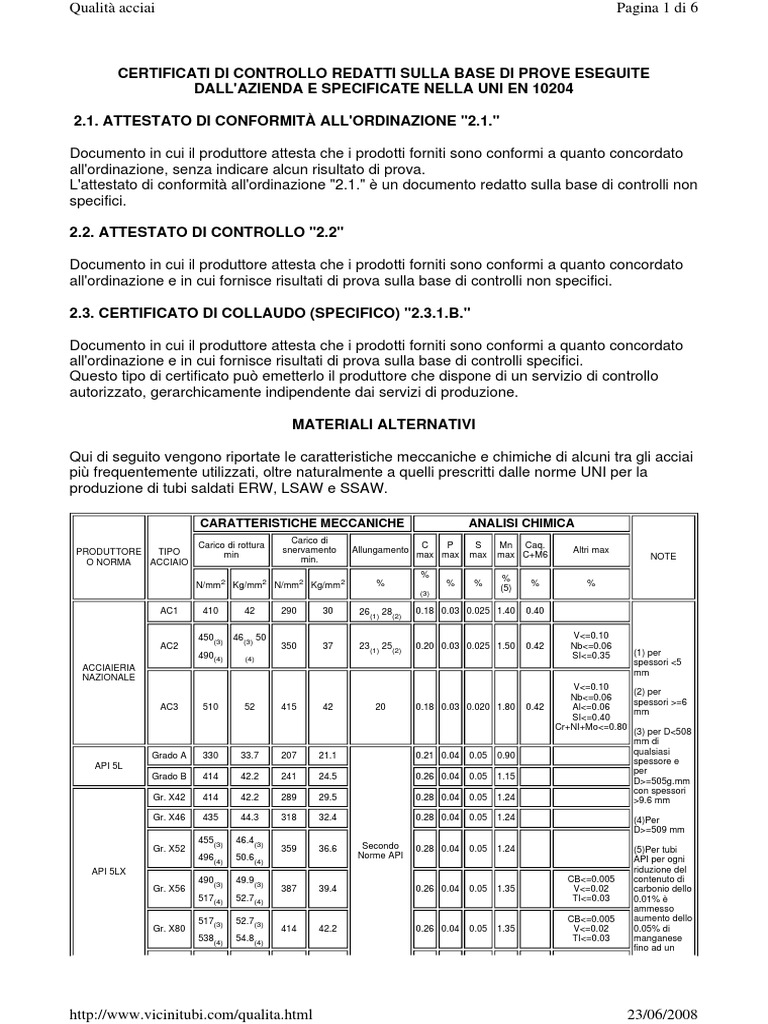 Qui di seguito vengono riportate le caratteristiche meccaniche e chimiche di alcuni tra gli acciai