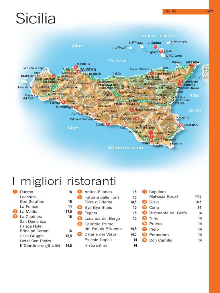 Piazza San Domenico 5, tel. 0942.613111. Sito: [Link]. Aperto: solo la sera; chiuso: luned; ferie: dal 4 gennaio al 31 marzo; dall1 novembre al 27 dicembre. Carte di credito: tutte. Prezzo medio: 120. Per molti anni nei grandi alberghi con storia e tradizione si fatta una cucina senza personalit che spingeva i clienti ad andare a mangiare fuori per sperimentare i sapori locali. Qui la scelta stata di creare una grande tavola e la scommessa riuscita, grazie a Massimo Mantarro, un cuoco siciliano giovane e umile che applica le tecniche pi moderne alle materie prime e ai piatti della tradizione isolana con tocchi personali. I risultati sono raffinati e stuzzicanti. Nella sfarzosa ma un po cupa sala o, molto meglio, sulla terrazza con splendida vista, sono da provare il filetto di maialino nero dei Nebrodi su purea di fagioli cannellini, cialda croccante e salsa al caff, la melanzana fredda (in squisita declinazione), i tagliolini con salsa di alici fresche, finocchietto e riccioli di bottarga, il pesce del giorno con i filanti di zucchina quarantina e il suo fiore fritto e mousseline di mandorle. Fra i dolci, fini e accattivanti, tutti dinequivocabile matrice siciliana, la brina: granite di caff e mandorla con piccola baguette e brioche e le variazioni di pistacchio di Bronte. Cantina importante con ricarichi sensibili. Conto di almeno 120 euro, con menu a 95 euro.