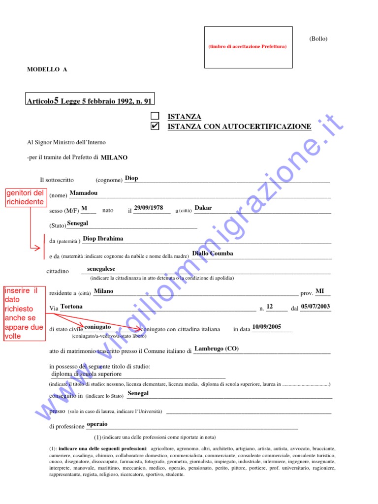 N.B. Il modulo deve essere compilato a cura del richiedente la cittadinanza in tutte le sue voci escluse quelle di cui non