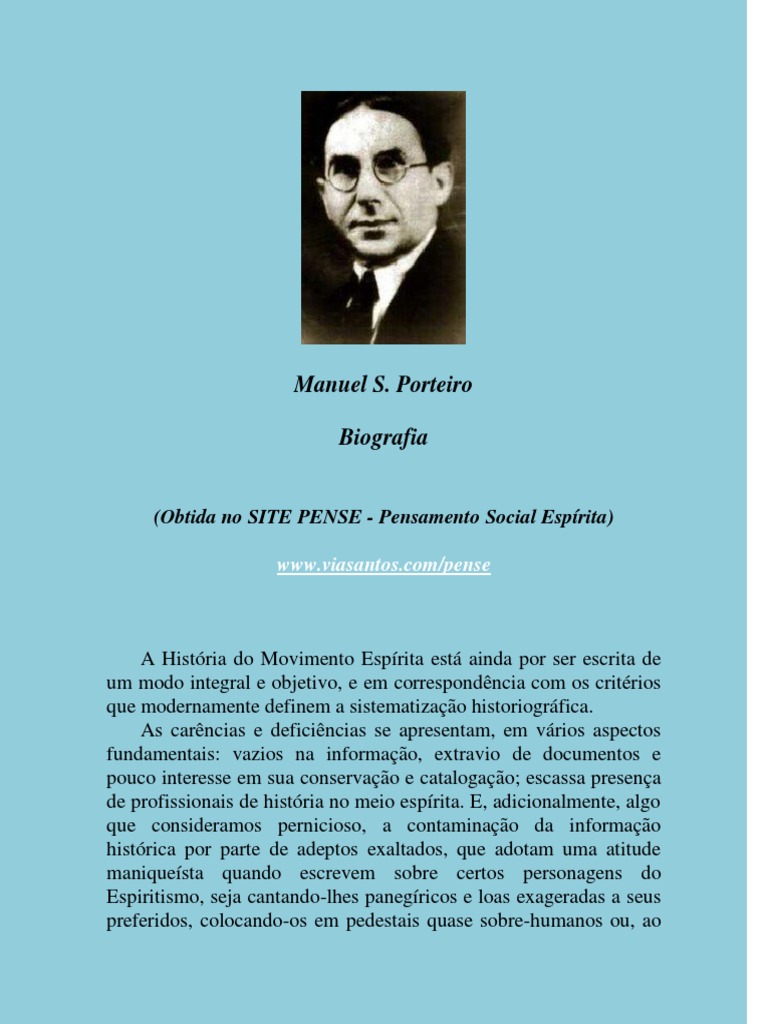 contrrio, negando todo o mrito a quem poderiam representar opinies diferentes das que eles adotam. Havendo perdido toda a objetividade, escrevem a histria no como ela , mas com como gostariam que ela fosse. O prprio Kardec e outras figuras fundamentais do pensamento esprita, tm sofrido numerosas distores, que necessrio ir corrigindo. Dizemos isso a propsito do personagem do qual nos ocupamos agora e que, com toda justia, o jornal Abertura selecionou entre os 20 pensadores espritas de maior relevncia no sculo 20, nosso querido e admirado Manuel S. Porteiro. Que, no apenas batalhou a favor de uma viso livre pensadora, progressista e humanista da doutrina kardecista, como tambm enfrentou as desqualificaes que lanaram h seu tempo os setores msticos e conservadores do Espiritismo na Argentina, seu pas natal. Acusaram-no de comunista, ateu, anti-religioso e outros adjetivos. E, aps sua desencarnao, a estratgia desses setores mudou de rumo e decidiram estender um manto de silncio sobre seu nome, sobre sua vida e seu pensamento. Chegou-se a proibir fraternalmente, a leitura de seus livros. Quando nos dispusemos a escrever um livro para recuperar sua memria histrica, conferir os dados bsicos de sua trajetria vital, e dar a conhecer seu pensamento s novas geraes espritas, tropeamos com essa muralha de silncio que se ergueu sobre sua vida e sua obra. Felizmente, pudemos faz-lo e nossa obra O Pensamento Vivo de Porteiro se encontra em suas edies em espanhol e em portugus, a disposio dos leitores que no se atemorizam ante os antemas e as proibies inquisitoriais de algumas federaes. Porteiro foi um esprita completo. Humilde trabalhador manual, amoroso pai de famlia, autodidata que adquiriu com esforo e imensos sacrifcios uma extraordinria formao intelectual, at chegar a dominar amplos espaos no mundo da cultura, da sociologia, da filosofia e, naturalmente, da Doutrina Esprita. Nasceu em Avellaneda, provncia de Buenos Aires, em 25 de maro de 1881 e desencarnou, ali mesmo, em 18 de fevereiro de