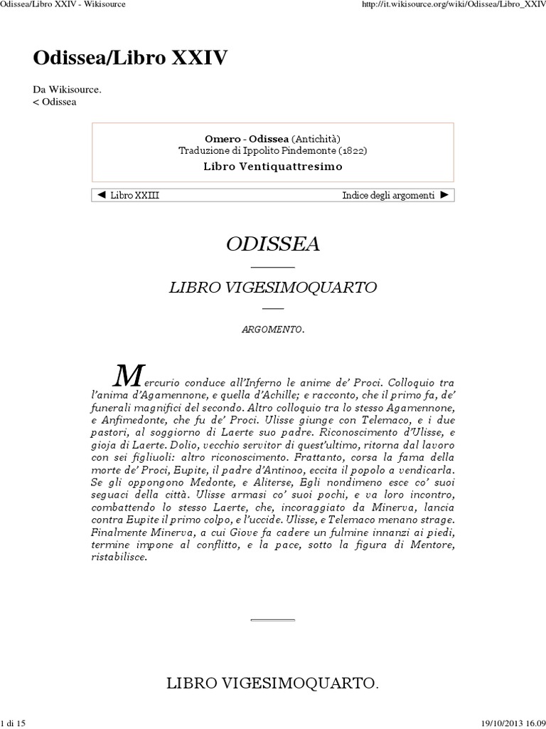 ercurio conduce allInferno le anime de Proci. Colloquio tra lanima dAgamennone, e quella dAchille; e racconto, che il primo fa, de funerali magnifici del secondo. Altro colloquio tra lo stesso Agamennone, e Anfimedonte, che fu de Proci. Ulisse giunge con Telemaco, e i due pastori, al soggiorno di Laerte suo padre. Riconoscimento dUlisse, e gioja di Laerte. Dolio, vecchio servitor di questultimo, ritorna dal lavoro con sei figliuoli: altro riconoscimento. Frattanto, corsa la fama della morte de Proci, Eupite, il padre dAntinoo, eccita il popolo a vendicarla. Se gli oppongono Medonte, e Aliterse, Egli nondimeno esce co suoi seguaci della citt. Ulisse armasi co suoi pochi, e va loro incontro, combattendo lo stesso Laerte, che, incoraggiato da Minerva, lancia contra Eupite il primo colpo, e luccide. Ulisse, e Telemaco menano strage. Finalmente Minerva, a cui Giove fa cadere un fulmine innanzi ai piedi, termine impone al conflitto, e la pace, sotto la figura di Mentore, ristabilisce.