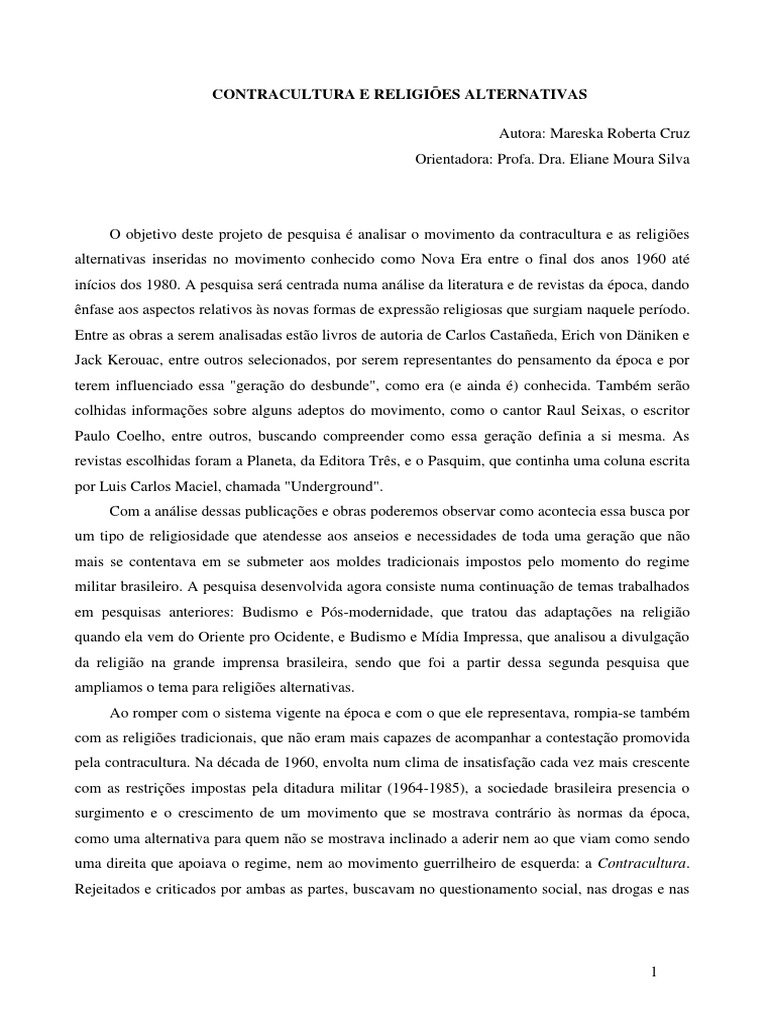 O objetivo deste projeto de pesquisa analisar o movimento da contracultura e as religies alternativas inseridas no movimento conhecido como Nova Era entre o final dos anos 1960 at incios dos 1980. A pesquisa ser centrada numa anlise da literatura e de revistas da poca, dando nfase aos aspectos relativos s novas formas de expresso religiosas que surgiam naquele perodo. Entre as obras a serem analisadas esto livros de autoria de Carlos Castaeda, Erich von Dniken e Jack Kerouac, entre outros selecionados, por serem representantes do pensamento da poca e por terem influenciado essa "gerao do desbunde", como era (e ainda ) conhecida. Tambm sero colhidas informaes sobre alguns adeptos do movimento, como o cantor Raul Seixas, o escritor Paulo Coelho, entre outros, buscando compreender como essa gerao definia a si mesma. As revistas escolhidas foram a Planeta, da Editora Trs, e o Pasquim, que continha uma coluna escrita por Luis Carlos Maciel, chamada "Underground". Com a anlise dessas publicaes e obras poderemos observar como acontecia essa busca por um tipo de religiosidade que atendesse aos anseios e necessidades de toda uma gerao que no mais se contentava em se submeter aos moldes tradicionais impostos pelo momento do regime militar brasileiro. A pesquisa desenvolvida agora consiste numa continuao de temas trabalhados em pesquisas anteriores: Budismo e Ps-modernidade, que tratou das adaptaes na religio quando ela vem do Oriente pro Ocidente, e Budismo e Mdia Impressa, que analisou a divulgao da religio na grande imprensa brasileira, sendo que foi a partir dessa segunda pesquisa que ampliamos o tema para religies alternativas. Ao romper com o sistema vigente na poca e com o que ele representava, rompia-se tambm com as religies tradicionais, que no eram mais capazes de acompanhar a contestao promovida pela contracultura. Na dcada de 1960, envolta num clima de insatisfao cada vez mais crescente com as restries impostas pela ditadura militar (1964-1985), a sociedade brasileira presencia o surgimento e o crescimento de um movimento que se mostrava contrrio s normas da poca, como uma alternativa para quem no se mostrava inclinado a aderir nem ao que viam como sendo uma direita que apoiava o regime, nem ao movimento guerrilheiro de esquerda: a Contracultura. Rejeitados e criticados por ambas as partes, buscavam no questionamento social, nas drogas e nas