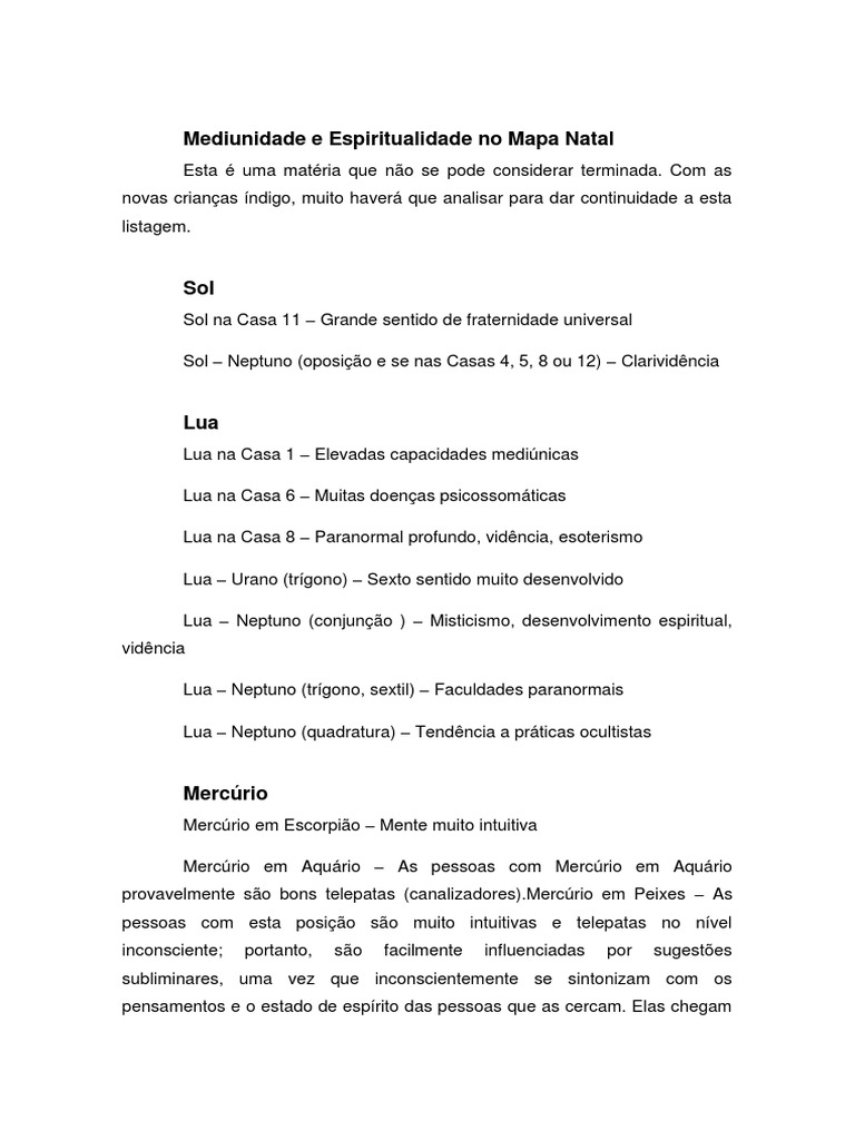 Lua na Casa 1 Elevadas capacidades medinicas Lua na Casa 6 Muitas doenas psicossomticas Lua na Casa 8 Paranormal profundo, vidncia, esoterismo Lua Urano (trgono) Sexto sentido muito desenvolvido Lua Neptuno (conjuno ) Misticismo, desenvolvimento espiritual, vidncia Lua Neptuno (trgono, sextil) Faculdades paranormais Lua Neptuno (quadratura) Tendncia a prticas ocultistas