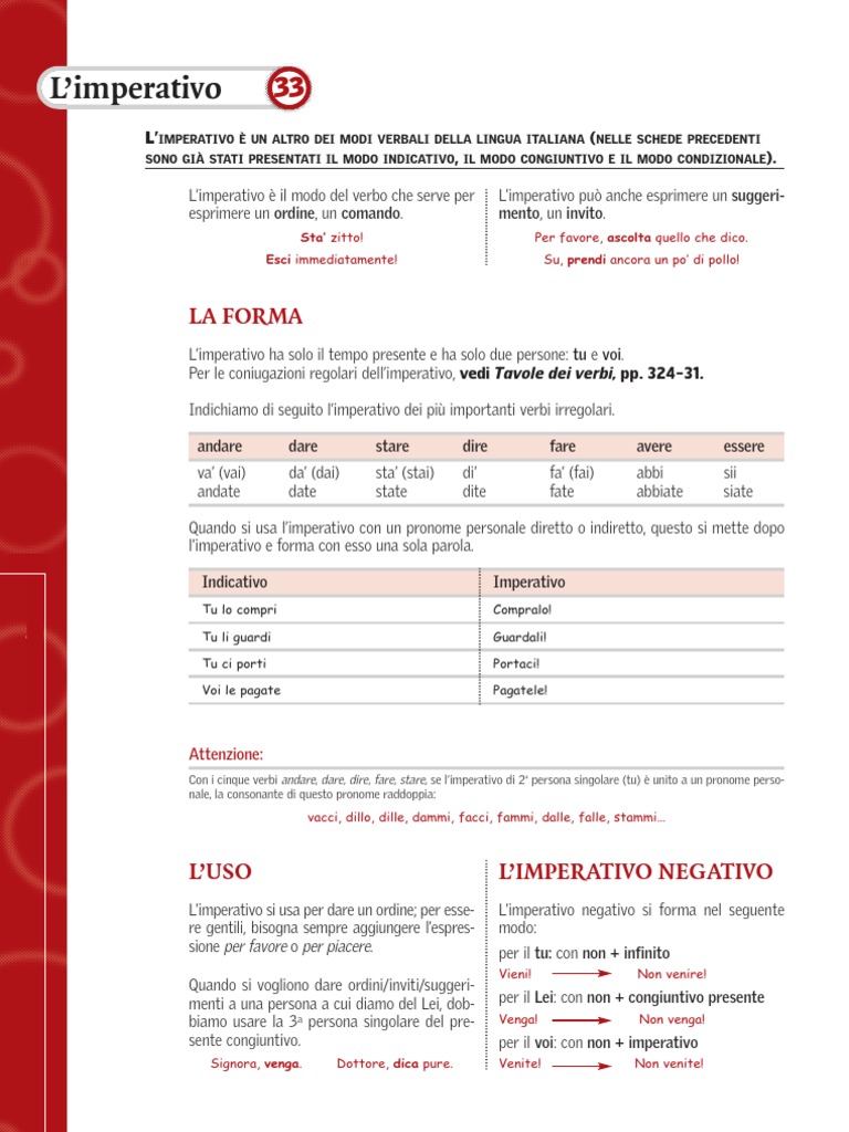Limperativo ha solo il tempo presente e ha solo due persone: tu e voi. Per le coniugazioni regolari dellimperativo, vedi Tavole dei verbi, pp. 324-31. Indichiamo di seguito limperativo dei pi importanti verbi irregolari. andare va (vai) andate dare da (dai) date stare sta (stai) state dire di dite fare fa (fai) fate avere abbi abbiate essere sii siate