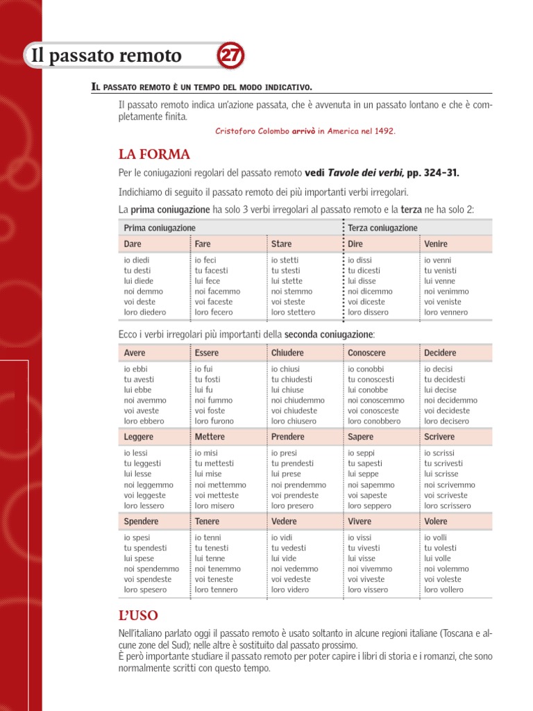 Per le coniugazioni regolari del passato remoto vedi Tavole dei verbi, pp. 324-31. Indichiamo di seguito il passato remoto dei pi importanti verbi irregolari. La prima coniugazione ha solo 3 verbi irregolari al passato remoto e la terza ne ha solo 2: