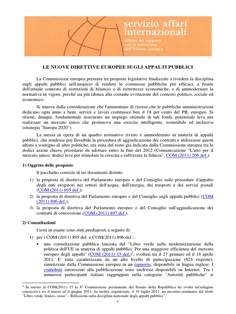 La Commissione europea presenta tre proposte legislative finalizzate a rivedere la disciplina sugli appalti pubblici nell'auspicio di rendere le commesse pubbliche pi efficaci, a fronte dell'attuale contesto di restrizioni di bilancio e di ristrettezze economiche, e di ammodernare la normativa in vigore, perch sia pi idonea alla costante evoluzione del contesto politico, sociale ed economico. Si muove dalla considerazione che l'ammontare di risorse che le pubbliche amministrazioni dedicano ogni anno a beni, servizi e lavori costituisce ben il 18 per cento del PIL europeo. Si ritiene, dunque, fondamentale assicurare un impiego ottimale di tali fondi, potenziale leva per realizzare un mercato unico che promuova una crescita intelligente, sostenibile ed inclusiva (strategia "Europa 2020"). La messa in opera di un quadro normativo rivisto e ammodernato in materia di appalti pubblici, che rendesse pi flessibile la procedura di aggiudicazione dei contratti e utilizzasse questi ultimi a sostegno di altre politiche, era stata del resto gi indicata dalla Commissione europea tra le dodici azioni chiave prioritarie da adottare entro la fine del 2012 (Comunicazione "L'atto per il mercato unico: dodici leve per stimolare la crescita e rafforzare la fiducia", COM (2011) 206 def.). 1) Oggetto delle proposte Il pacchetto consiste di tre documenti distinti: 1) la proposta di direttiva del Parlamento europeo e del Consiglio sulle procedure d'appalto degli enti erogatori nei settori dell'acqua, dell'energia, dei trasporti e dei servizi postali (COM (2011) 895 def.); 2) la proposta di direttiva del Parlamento europeo e del Consiglio sugli appalti pubblici (COM (2011) 896 def.); 3) la proposta di direttiva del Parlamento europeo e del Consiglio sull'aggiudicazione dei contratti di concessione (COM (2011) 897 def.). 2) Consultazioni I testi in esame sono stati predisposti a seguito di: 1) per i COM (2011) 895 def. e COM(2011) 896 def.: una consultazione pubblica lanciata dal "Libro verde sulla modernizzazione della politica dell'UE in materia di appalti pubblici. Per una maggiore efficienza del mercato europeo degli appalti" (COM (2011) 15 def.)1, svoltasi tra il 27 gennaio ed il 18 aprile 2011. E' stata caratterizzata da un alto livello di partecipazione (623 risposte), sintetizzate dalla Commissione europea in un rapporto, disponibile in lingua inglese. I contributi autorizzati alla pubblicazione sono anch'essi disponibili su Internet. Tra i numerosi partecipanti italiani raggruppati nella categoria "Autorit pubbliche" si