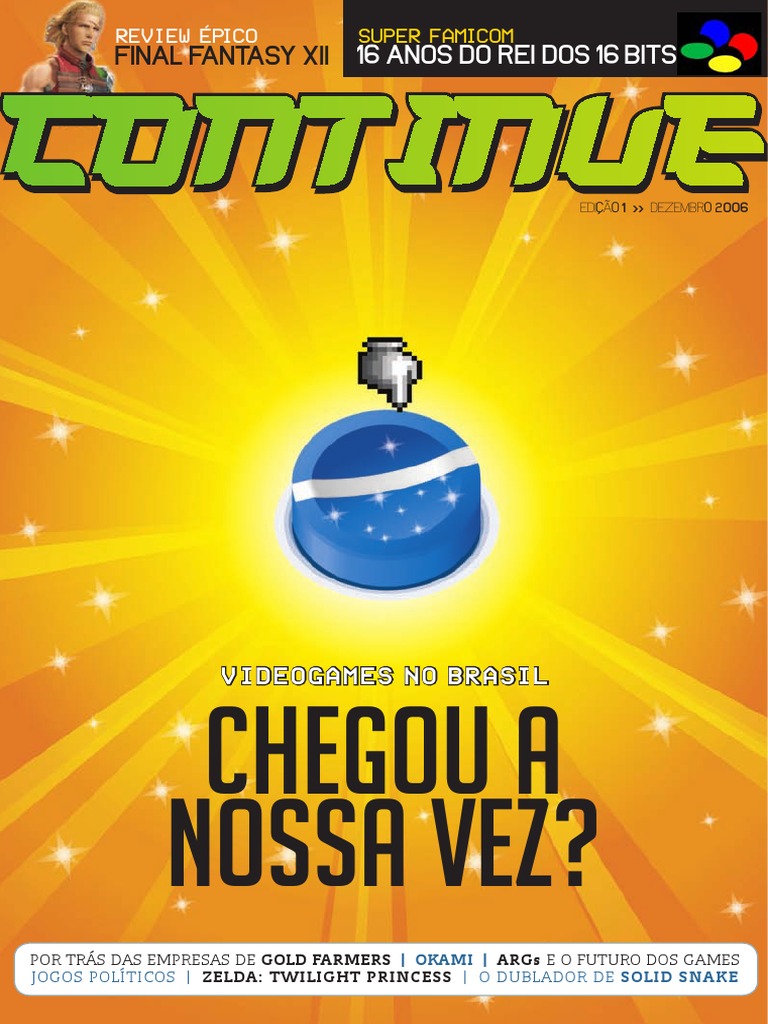 Aos poucos, os games vo deixando para trs o rtulo de puro entretenimento e sendo encarados como parte de um universo complexo que envolve arte, narrativa, cultura, poltica, economia, comportamento. Alm de parte de um mercado que j lucra mais que a indstria do cinema, os games so assunto de centenas de estudos acadmicos, capas de revistas conceituadas, fonte de inspirao, criadores de hbitos, palco de experimentaes e revolues artsticas e tecnolgicas. Games so um estilo de vida, e esto mudando a forma como as novas geraes encaram o mundo. A Continue leva os games a srio. E, se voc um dos cerca de 1 milho de gamers brasileiros que pensam como ns, sabe que o mercado de revistas especializadas anda precisando de uma sacudida. O modelo de publicaes com dicas, estratgias, anlises e prvias superficiais j est batido: esse tipo de informao pode ser encontrado em grande quantidade e qualidade na Internet. Assim, em nossas pginas iremos muito alm do que voc v na tela quando joga, e daquilo que voc encontra na rede. Ao mesmo tempo em que traremos os melhores previews e reviews de que voc precisa para no se perder pela enxurrada de novos lanamentos todos os meses, vamos a fundo em reportagens, notcias e artigos sobre o que e quem est por trs dos jogos - e sobre o que est alm. Novas idias, novas tendncias, novos paradigmas. Tal qual um continue permite continuar se aventurando num jogo, estendendo a diverso, ns seremos uma extenso da sua vida no mundo dos videogames. De fato, esta no mais uma revista sobre jogos. uma revista sobre cultura gamer. Continue ligado! Um abrao e vidas infinitas,