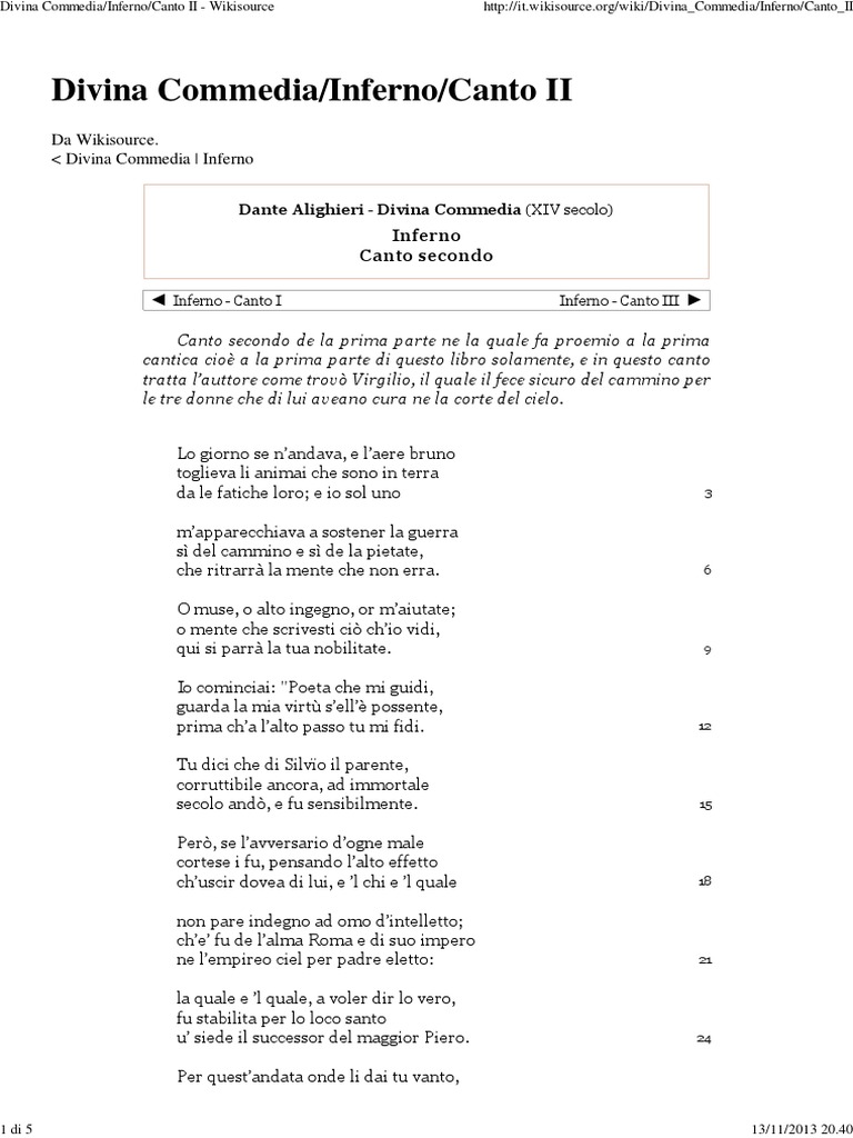 Canto secondo de la prima parte ne la quale fa proemio a la prima cantica cio a la prima parte di questo libro solamente, e in questo canto tratta lauttore come trov Virgilio, il quale il fece sicuro del cammino per le tre donne che di lui aveano cura ne la corte del cielo. Lo giorno se nanda a! e laere "r#no toglie a li ani$ai c%e sono in terra da le fatic%e loro& e io sol #no $a''arecc%ia a a sostener la g#erra s( del ca$$ino e s( de la 'ietate! c%e ritrarr) la $ente c%e non erra* + $#se! o alto ingegno! or $ai#tate& o $ente c%e scri esti ci, c%io idi! -#i si 'arr) la t#a no"ilitate* Io co$inciai. /0oeta c%e $i g#idi! g#arda la $ia irt1 sell2 'ossente! 'ri$a c%a lalto 'asso t# $i fidi* 3# dici c%e di 4il 5o il 'arente! corr#tti"ile ancora! ad i$$ortale secolo and,! e f# sensi"il$ente* 0er,! se la ersario dogne $ale cortese i f#! 'ensando lalto effetto c%#scir do ea di l#i! e l c%i e l -#ale non 'are indegno ad o$o dintelletto& c%e f# de lal$a 6o$a e di s#o i$'ero ne le$'ireo ciel 'er 'adre eletto. la -#ale e l -#ale! a oler dir lo ero! f# sta"ilita 'er lo loco santo # siede il s#ccessor del $aggior 0iero* 0er -#estandata onde li dai t# anto!