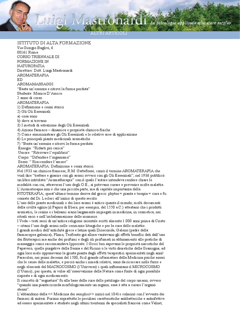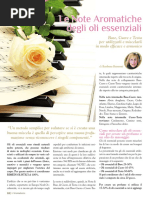 irrimediabilmente la fragranza. 2) Lestrazione per spremitura un procedimento riservato ai frutti del genere Citrus (agrumi) che contengono in cellule superficiali una grande quantit di essenze. Si procede come segue: la scorza del frutto fresco viene posta in sacchetti di crine, quindi sottoposta a forte pressione in particolari torchi a mano oppure idraulici. Lazione meccanica, conseguente alla pressione esercitata, provoca la rottura degli otricoli e la fuoriuscita dellolio essenziale che viene poi raccolto. 3) Lestrazione per Enflorange prevede luso di lastre di vetro ricoperte di grasso in cui si mettono a macerare i fiori che vengono cambiati tutti i giorni. Dal grasso, tramite lalcool etilico, si estraggono, a freddo, i principi odorosi. Il grasso verr poi utilizzato per i saponi dellindustria cosmetica. AZIONE FARMACO DINAMICA E PROPRIETA CHIMICO - FISICHE DEGLI OLI ESSENZIALI In Aromaterapia si individuato che esiste un legame tra la velocit di evaporazione e leffetto che le essenze hanno sul corpo e sulla mente; ad esempio: quelle di tono SUPERIORE (come Rosmarino e Salvia) agiscono pi in fretta, di solito rinfrancano e stimolano la mente; le essenze di tono DI BASE (legni e resine), invece, sono rilassanti e sedative, in genere molto efficaci nei casi cronici; quelle, infine, di tono MEDIO (Lavanda, Issopo, ecc.) riequilibrano le funzioni dei vari organi ed il metabolismo. Ogni Olio Essenziale formato da diverse molecole organiche solubili in alcoli, oli, emulsionanti, etere o cloroformio e dalla cui concentrazione dipendono la loro fragranza ed attivit terapeutica. Gli O.E. sono fluidi, spesso incolori, pi aromatici della pianta da cui derivano. Sono insolubili in acqua, generalmente pi leggeri della stessa, tranne alcuni o.e. quali Aglio, Mandorle e Senape che sono pi pesanti. COME SOMMINISTRARE GLI O.E. Gli Oli essenziali penetrano nellorganismo attraverso tre vie principali: o Assunzione per via interna o ingestione; o Inalazione; o Assorbimento attraverso la pelle. Lassunzione per via interna: lolio essenziale viene ingerito con un diluente (alcool, miele, zucchero, olio doliva, ecc.) ulteriormente diluito in acqua. La dose massima sicura di 3 gocce, 3 volte al giorno per 3 settimane, considerando sempre la singola persona e lolio essenziale utilizzato. Tale via di assunzione prevede pure limpiego per via rettale o vaginale, mediante supposte o candelette (dose massima giornaliera: 6). Linalazione: uno dei metodi di assunzione pi diffusi, particolarmente efficace nel trattamento di disturbi emotivi, stress, ansia e depressione. Infatti, il naso direttamente collegato con il cervello che, stimolato dai componenti chimici dellolio essenziale, innesca subito una serie di reazioni biochimiche riequilibranti. Questo, inoltre, il metodo migliore nel trattamento dei disturbi dellapparato respiratorio. Linalazione pu essere effettuata: attraverso una pezzuola o un fazzoletto, applicando 1-3 gocce e inalando con alcuni respiri profondi; con diffusori di aromi per lambiente, aggiungendo 3-8 gocce nellapposita vaschetta riempita dacqua e posizionata su una fonte di calore; con un erogatore spray, indicato soprattutto per disinfettare rapidamente laria (aggiungere, in questo caso, 10 gocce di o.e. a 250 ml di acqua distillata, agitare bene e nebulizzare nellambiente). Il bagno un trattamento molto efficace perch le essenze entrano in contatto con la pelle in modo delicato e vengono anche inalate; aggiungere 10-15 gocce ad un emulsionante quale miele, latte o panna e diluire nellacqua del bagno. Lassorbimento attraverso la pelle: effettuato soprattutto attraverso il massaggio, prevede limpiego degli Oli Essenziali diluiti con un olio vegetale (mandorle dolci, jojoba, vinacciolo, oliva, cocco, germe di grano, nocciola, sesamo, ecc.). In genere, bastano 10-15 gocce di un olio essenziale o di una miscela di pi oli, per 30 ml di olio vettore. N.B.: Non utilizzare mai gli O.E. puri sulla pelle! AREE DI APPLICAZIONE DEGLI OLI ESSENZIALI APPARATO DIGERENTE a) O.E. che aumentano lappettito e migliorano la digestione: Angelica, Camomilla matricaria, Dragoncello, Salvia e Timo. b) O.E. che svolgono unazione antispasmodica: Anice verde o stellato, Basilico, Camomilla matricaria, Canella, Lavanda, Melissa e Menta. c) O.E. ad azione carminativa: Anice verde, Carvi, Finocchio e Cumino. d) O.E. ad azione antifermentativa: Anice stellato, Carvi, Origano, Rosmarino, Salvia, Timo e Maggiorana. e) O.E. ad azione coleretica (attivanti la secrezione biliare) e colagoga (che aiutano